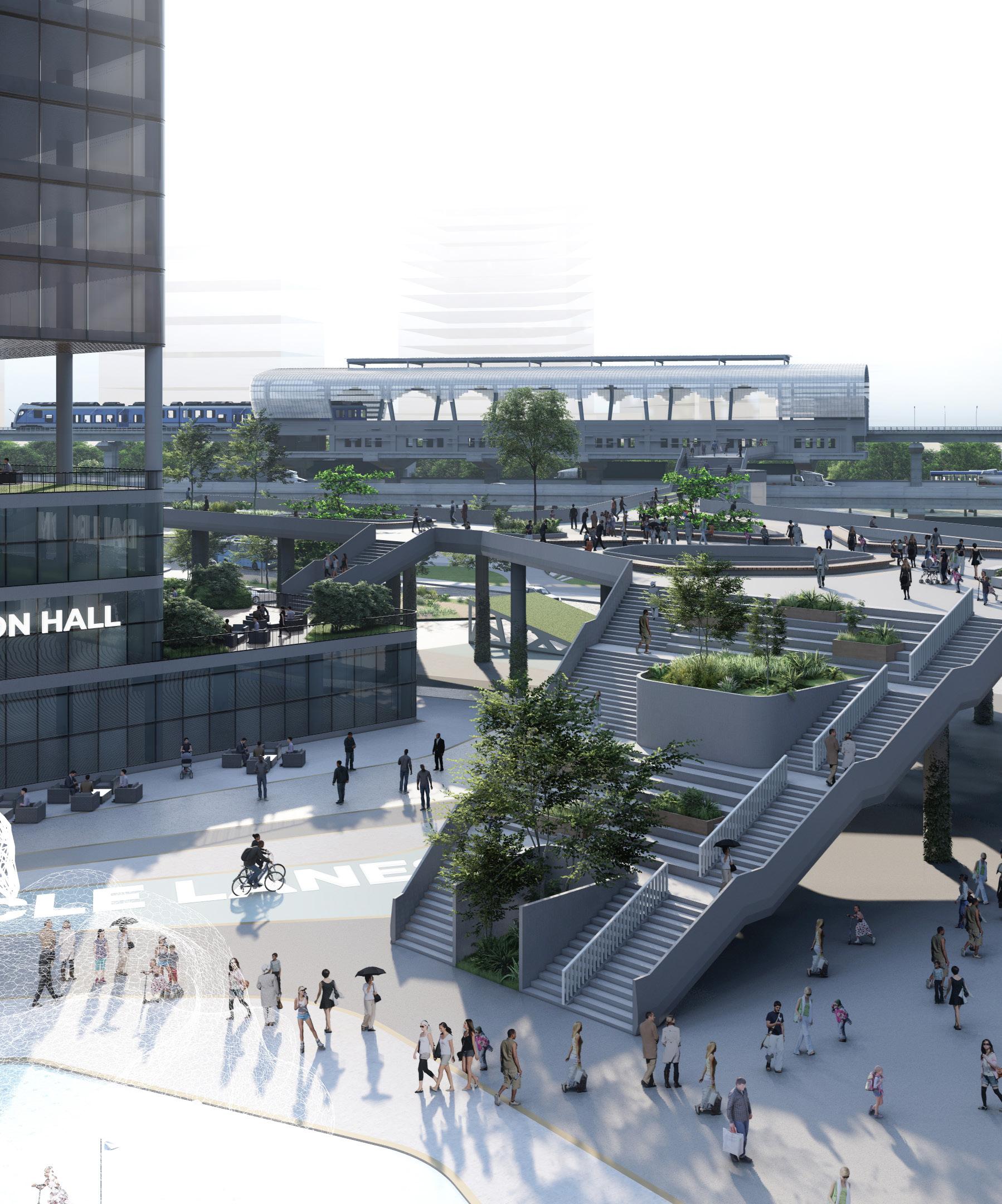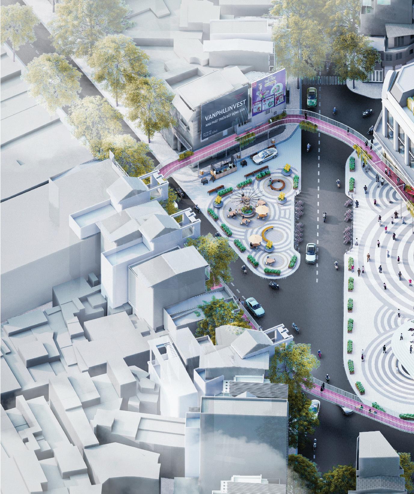 Sau khi phân tích các tuyến đường giao cắt cũng như mật độ giao thông trong ngày, hoạch định nên được hình thái của quảng trường. Phần mái lối xuống hầm sẽ được thiết kế trở thành một quảng trường nổi kết nối với tầng 2 của chợ hàng Da. Đây sẽ là trái tim của quảng trường kết nối cả khu vực
