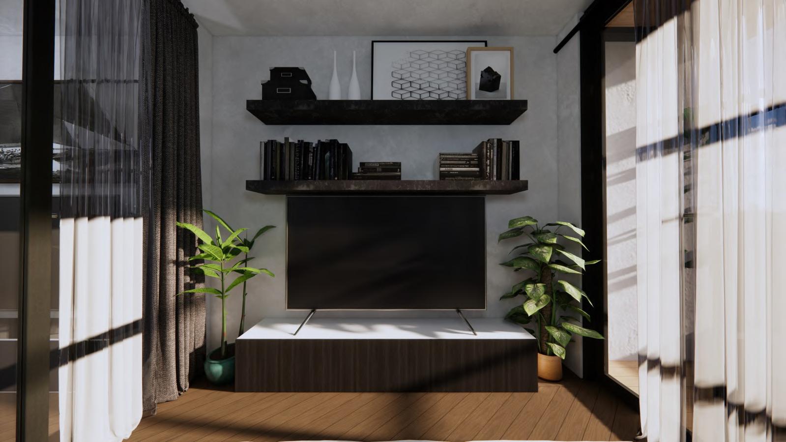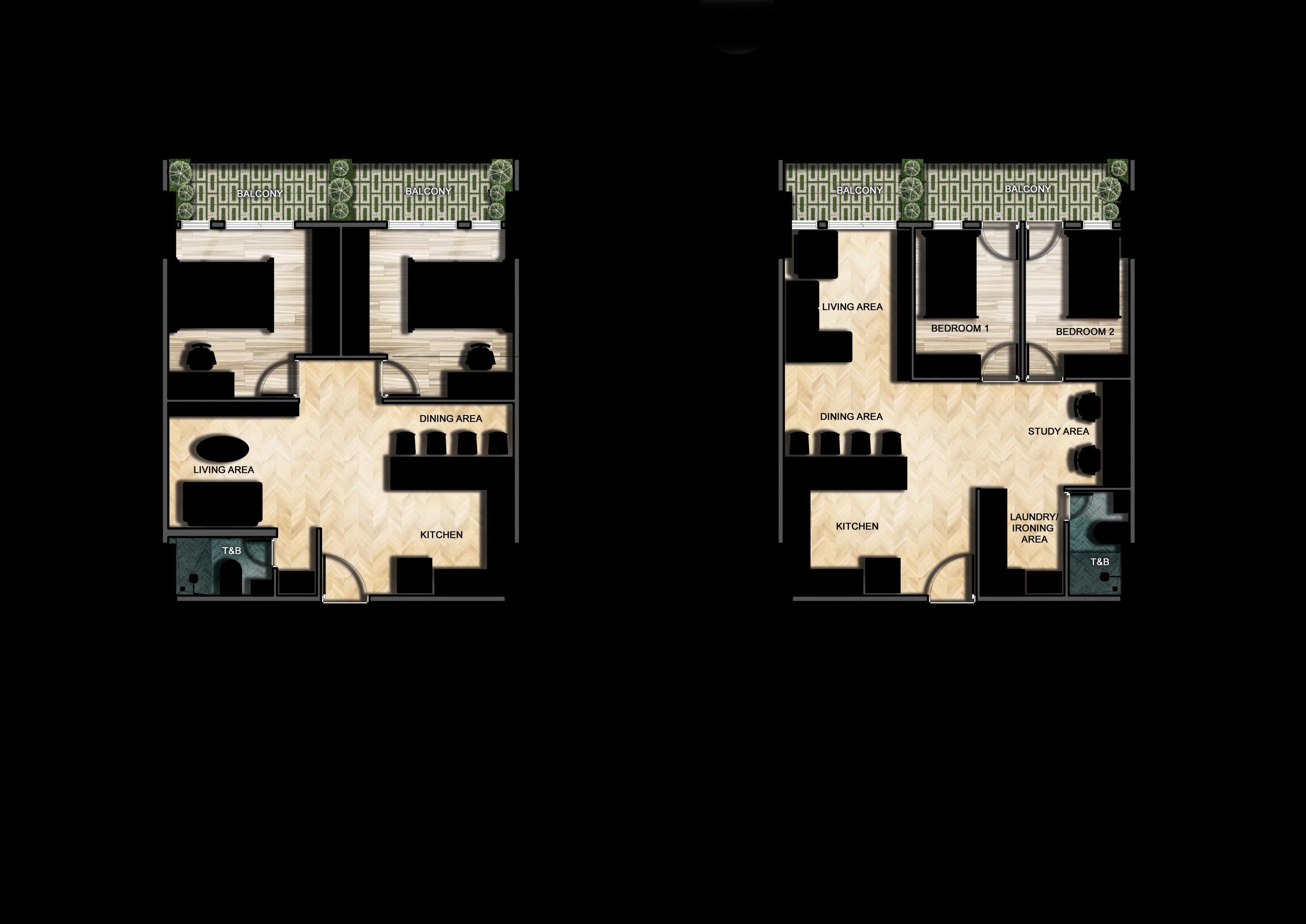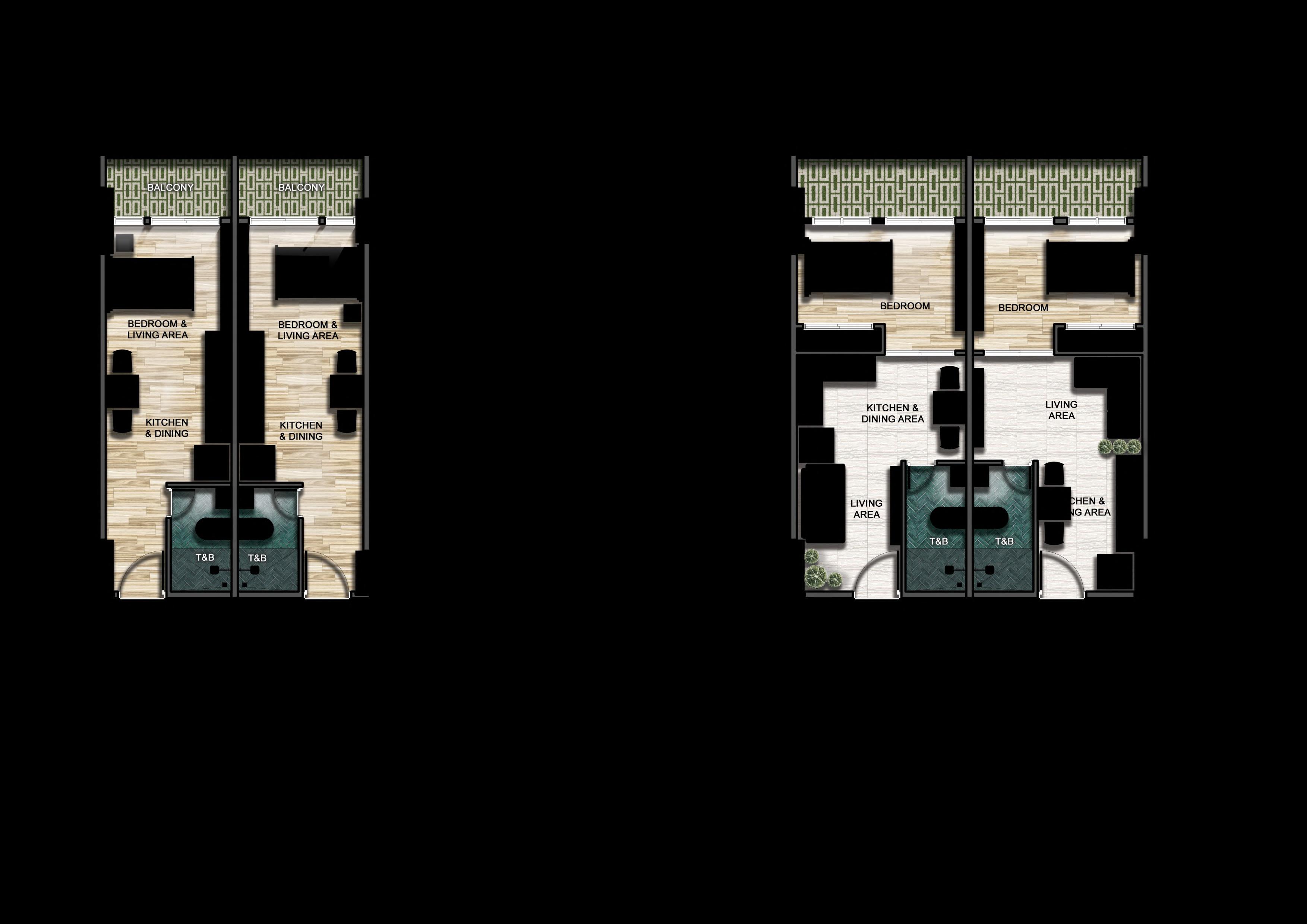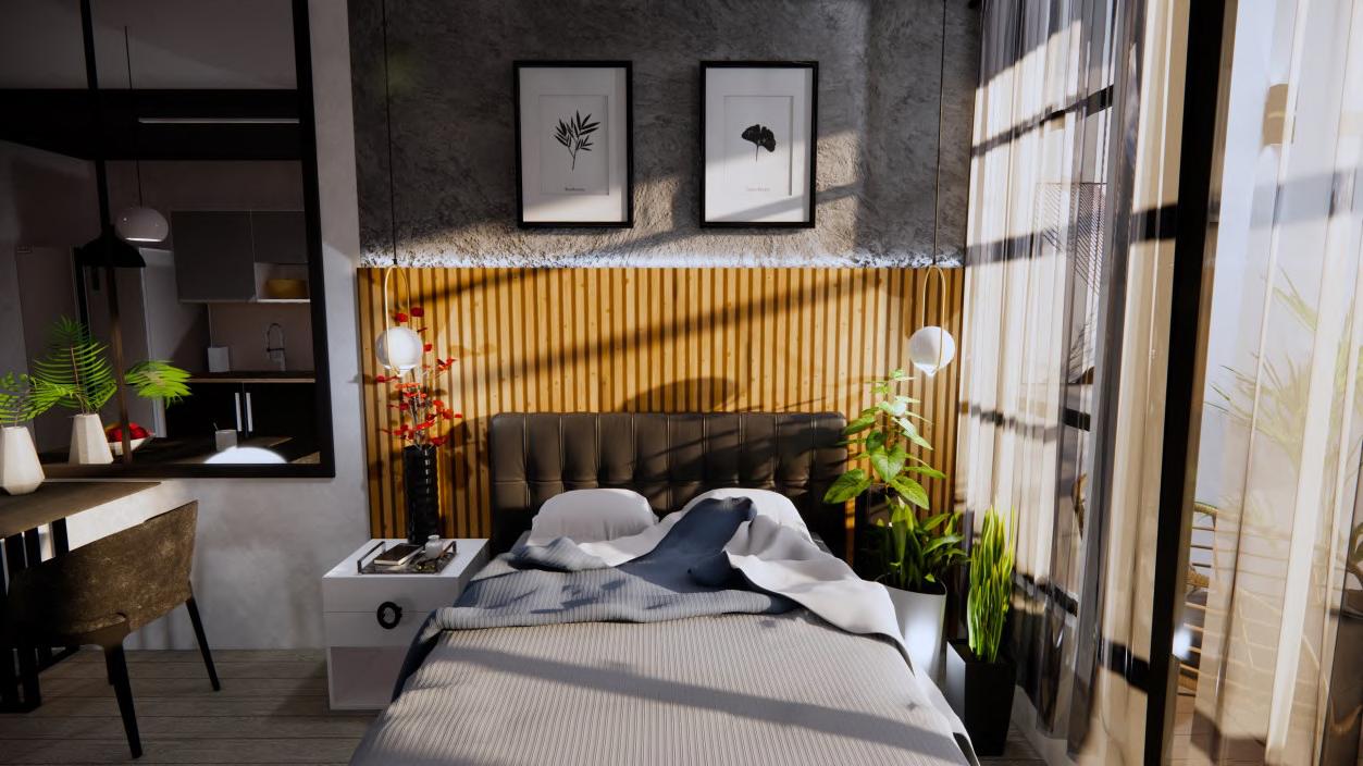 Two distinct designs are offered for this one bedroom property, giving prospective tenants the opportunity to select a preferred space to live. With the same laid back and natural vibe, these two spaces possessed contrasting moods. In accordance with the users' preferences, each design exhibited a distinct warm and cool elegant approach.