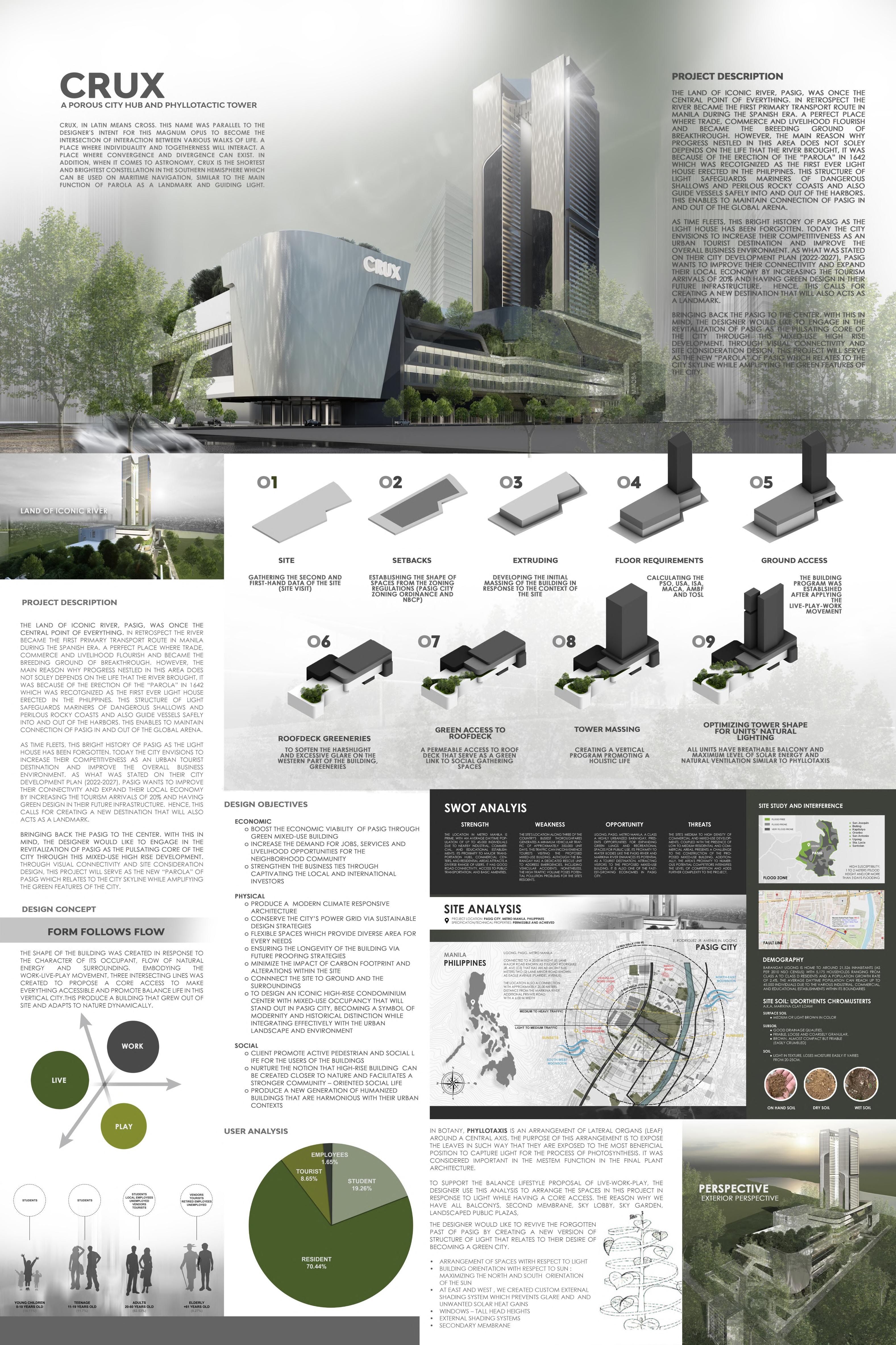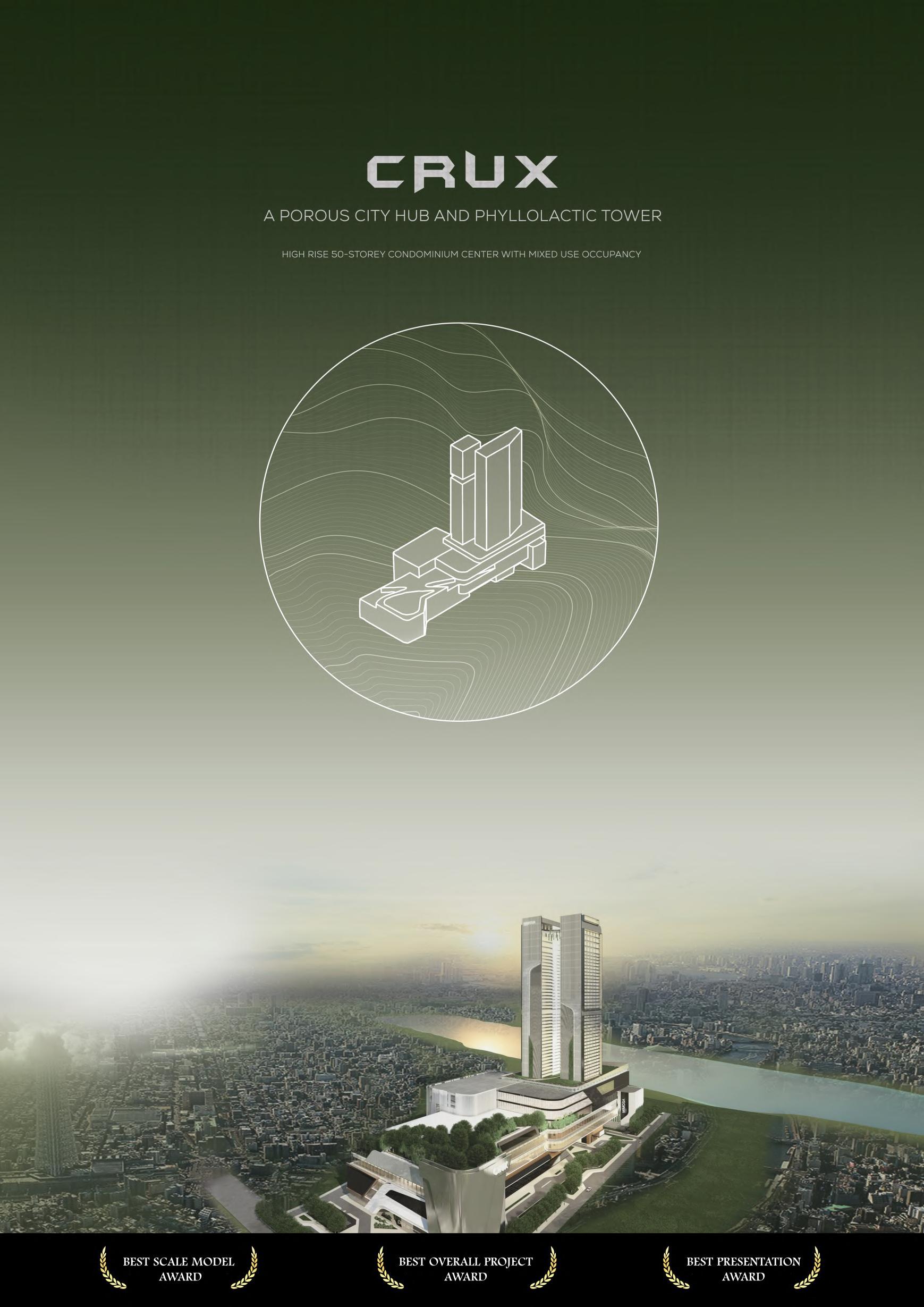 CRUX: "A Porous City Hub and Phyllotactic" stands as a collaborative endeavor involving 12 team members, each assigned specific roles to accomplish and compete in the project. It represents my most recent involvement and forms a crucial part of our DESIGN VIII final requirements. Being one of the members, I undertook multiple roles and collaborated with various teams. This project has been an exceptional experience, as we achieved remarkable success by securing the top awards in a competition against all the other groups comprising 4th-year architecture students from Cavite State University. The awards included Best Scale Model, Best Presentation, and ultimately, the Best Overall Project. I take immense pride in being one of the key contributors to this project's success. Being part of this group was a great learning experience for me as an architecture student. Even though some of my team members were more skilled in certain areas, I still contributed significantly to the project. Collaboration and openness were key values within our team. During the Pre phase, I had the privilege of being part of the conceptual team, where only two of us worked together out of the total twelve. My selection for this role was based on my potential to create a strong concept for such a substantial project. As we transitioned into the production phase, everyone was involved in the planning process. I, along with three other team members, took on the responsibility of planning and designing the tower, which encompassed residential and leisure spaces. Additionally, I was thrilled to be part of the team working on the Scaled Model, as it marked my first time creating a scaled model for such a significant project. Apart from these major roles, I also worked on rendering and designing interiors, like the units for the condominium, food court, and leisure area. I also played a part in finalizing plans using AutoCAD. Additionally, I helped with the presentation and was one of the presenters during our project defense. Overall, this experience helped me grow as an architecture student, and I'm proud of the contributions I made to the project.