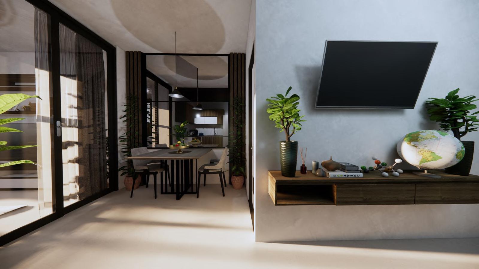 A seamless connection between organic and modern style was intended to be expressed through the design of the interior. By using simple, modern furnishings, natural materials like wood and concrete as a neutral foundation between nature and modernity, floor to ceiling windows and doors for access to natural light, andeffectiveuseofspace.