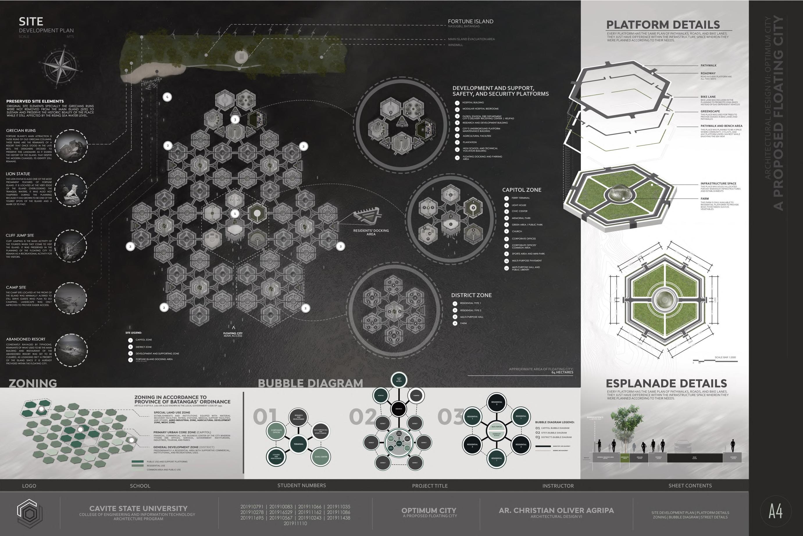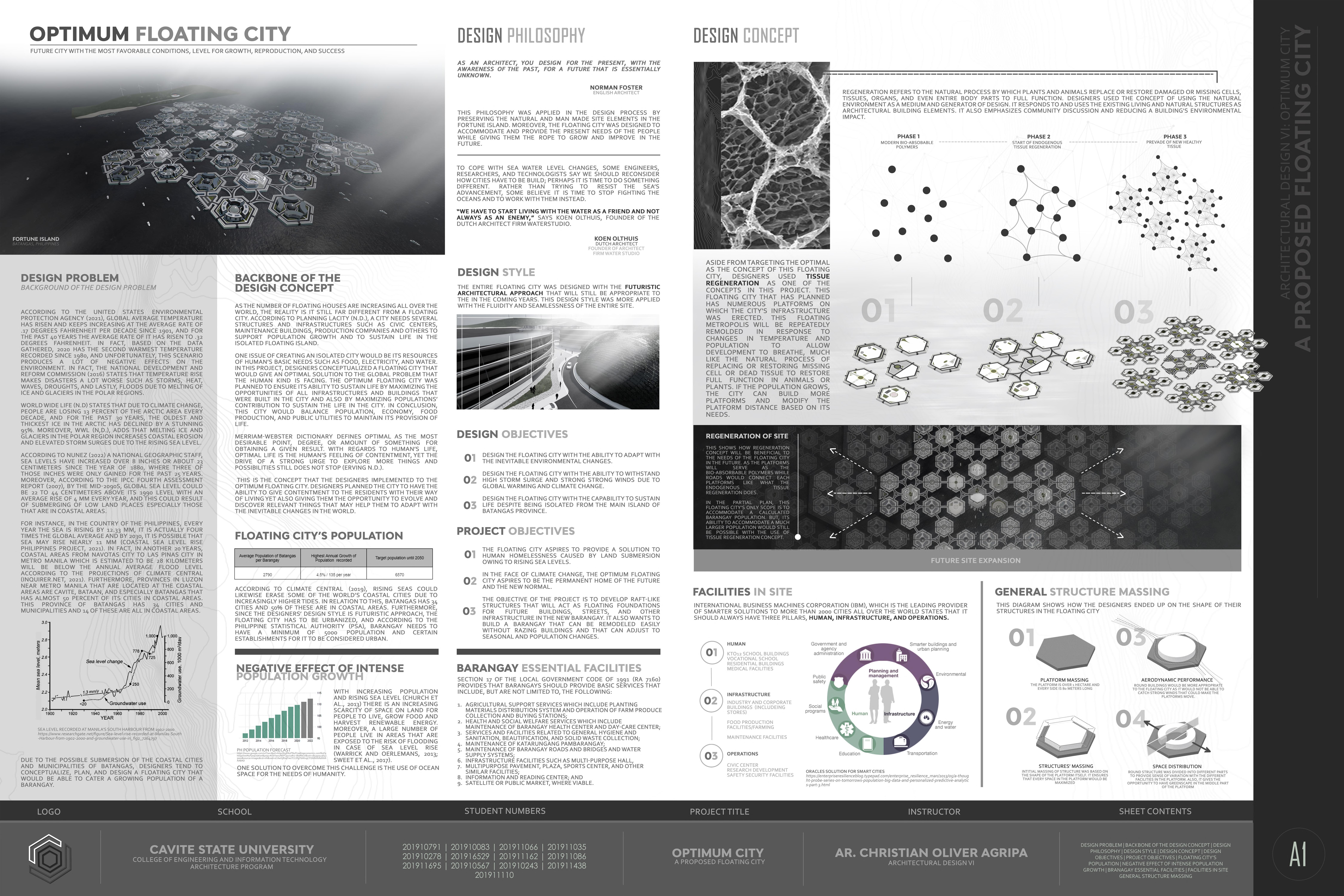 "Optimum City: A Regenerative Floating City" was a collaborative project that served as our final requirement for DESIGN VI. It involved 13 team members, each assigned different roles to complete and compete in the project. This experience felt like a real-life project that could prepare me for future challenges, especially because it took place during the pandemic. Working on this project was a new and exciting opportunity for me, as it was my first time collaborating with more than 10 team members and competing with other students from Cavite State University. However, the journey wasn't easy for any of us since we had to rely on online communication due to the pandemic restrictions. Despite the challenges, we made it a priority to meet in person during the final week before submission. This allowed us to establish strong connections and a shared understanding of the overall project we were creating. I can say that this experience of mine from this project has shaped me into what I am now in this field and how I work with people around me.