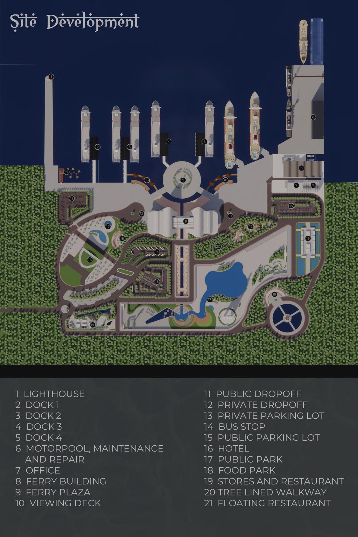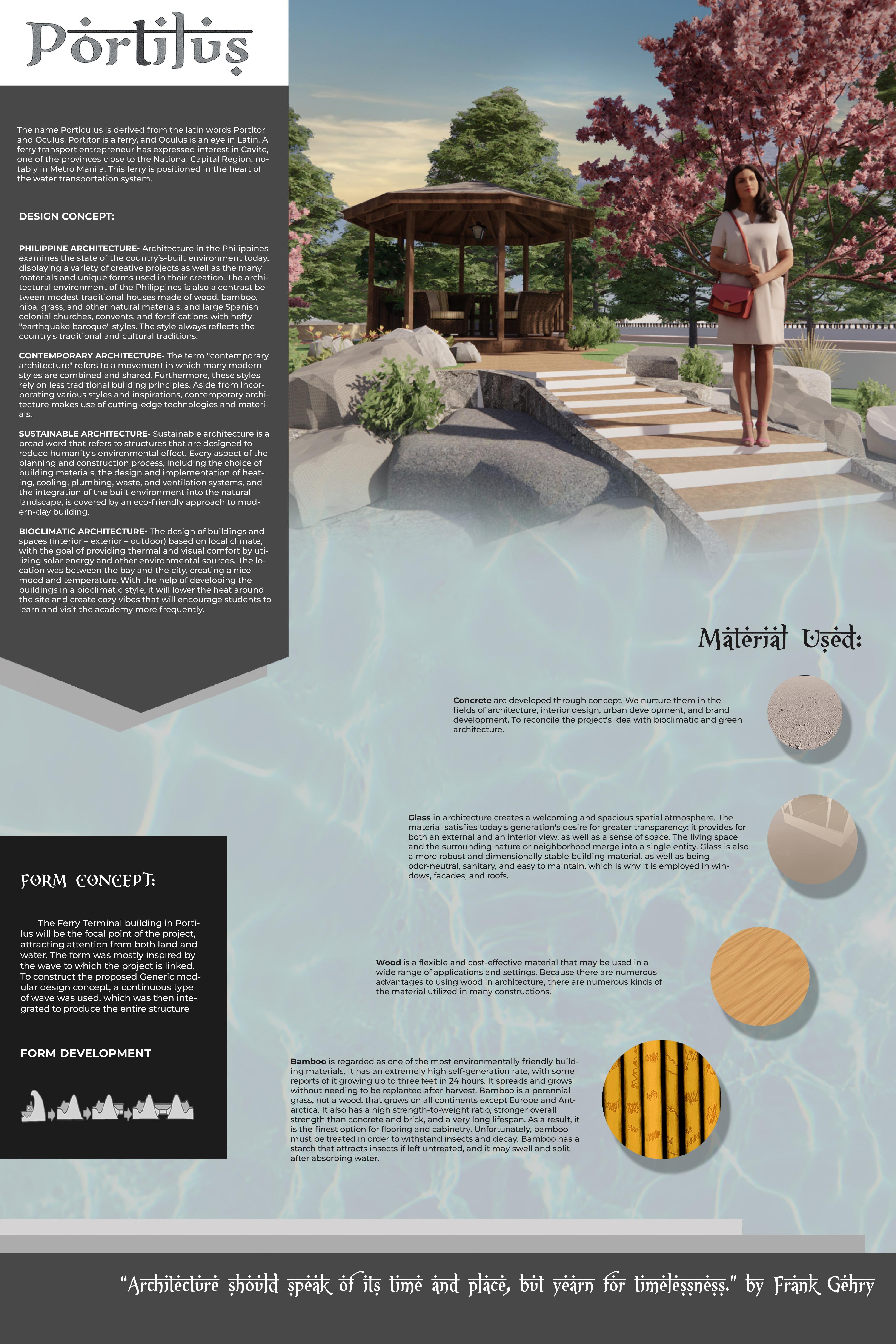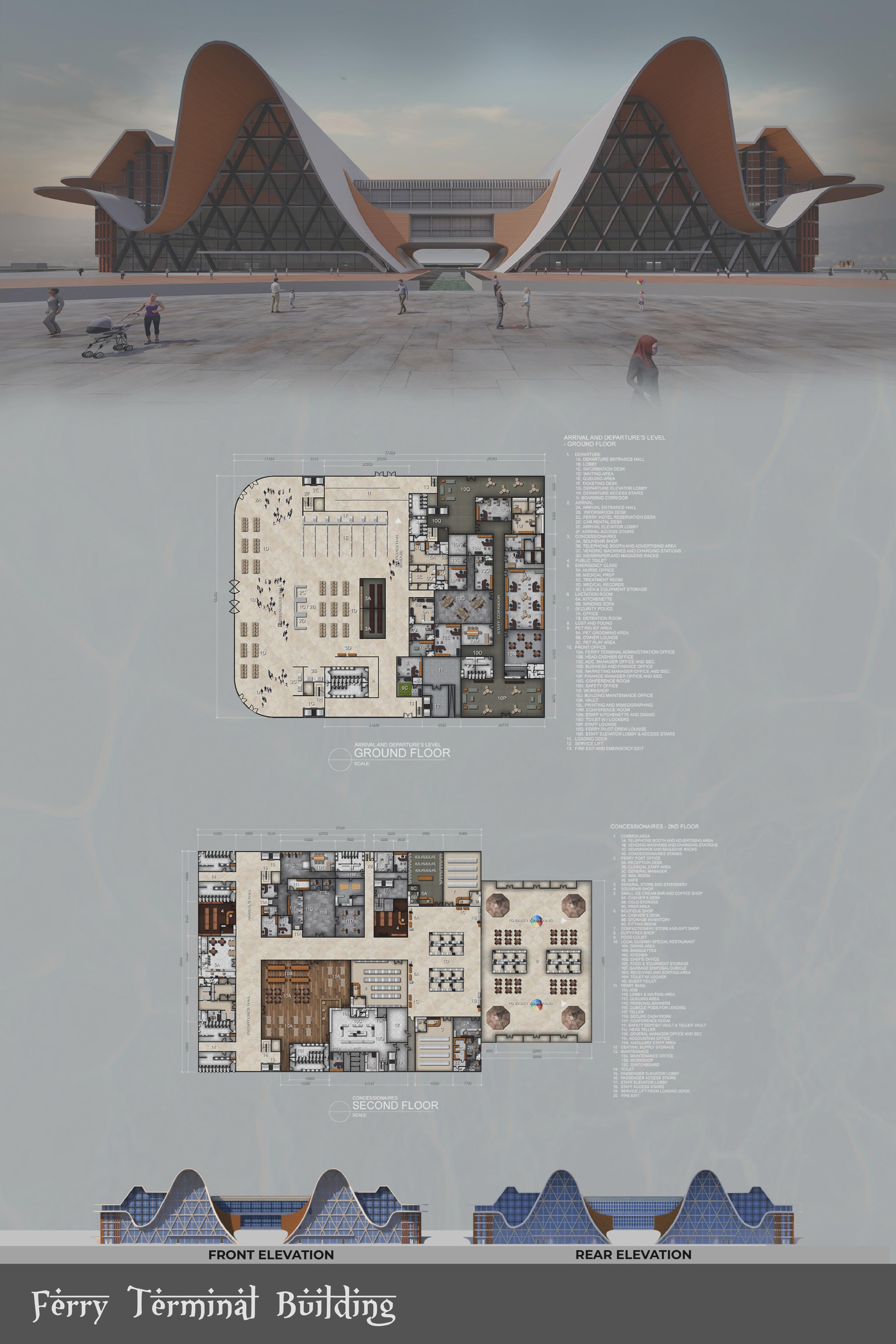 "Portilus: A Proposed Cavite Coastal Ferry Terminal" serves as our final plate requirement for DESIGN V, and it's a collaborative project involving 10 members. This project posed a bit of a challenge for me as it marked my first experience in collaborating on the planning of a significant facility, particularly the ferry terminal. In my previous projects, I had mainly focused on conceptualization and design ideas, but planning a large structure was a new endeavor. For this project, I worked closely with three other team members to handle the planning and design of the ferry terminal. My specific responsibility was to plan the ground floor of the terminal, and I was also entrusted with designing the interiors for that floor and some other levels. Beyond my role in planning and design, I actively contributed to the overall aesthetics, ideas, and concept of the structure. Additionally, I took the a contribution in creating the conceptual sheet and defining the overall project concept.