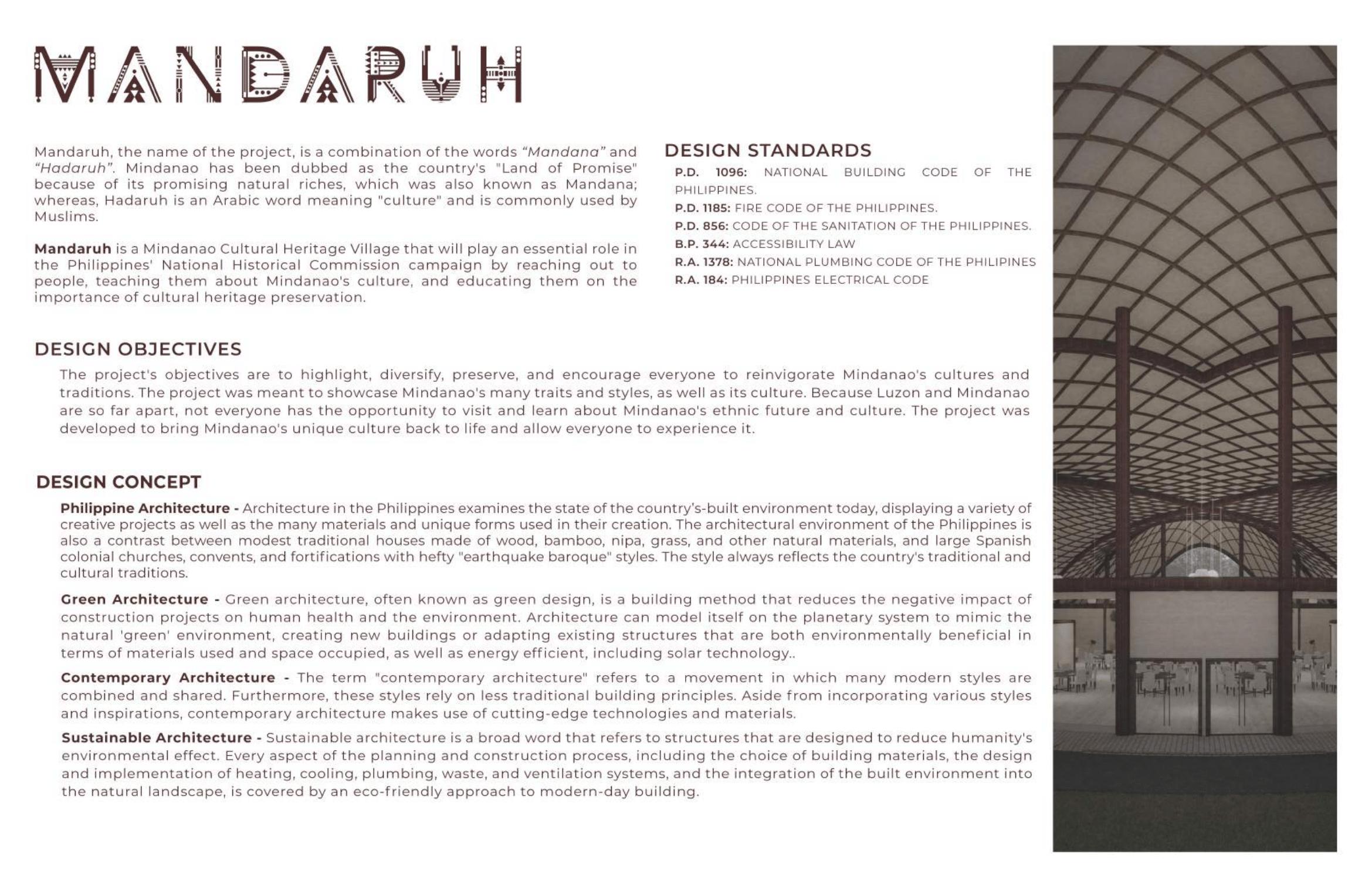 "Mandaruh: A Cultural Heritage Village" is a collaborative project of mine and my partner that was assigned to us for our Major Plate requirement in DESIGN V. Recalling the moments I am collaborating on this project flutters me, for I can say that this is where I am starting to learn more in the world of digital. My partner here is a part of the crem U U w w excels me in so many ways in this project. But I take that as an opportunity for me to grow and learn more from her. So I can proudly say that I became a big part of this project despite having beginner skills in so many ways. To begin with my contributions, the conceptualizations were done by me and my partner, and I made all the contents of our concept sheet. We divided the facilities we had to plan and design; I took all of the support facilities, food court, pavilions, amphitheater, special event hall, Torogan and T boli houses, and most of the interiors, especially where I was involved in planning and designing. Being a part of this project allowed me to expand my skills and knowledge, and I am grateful for the opportunity to contribute significantly alongside my talented partner.