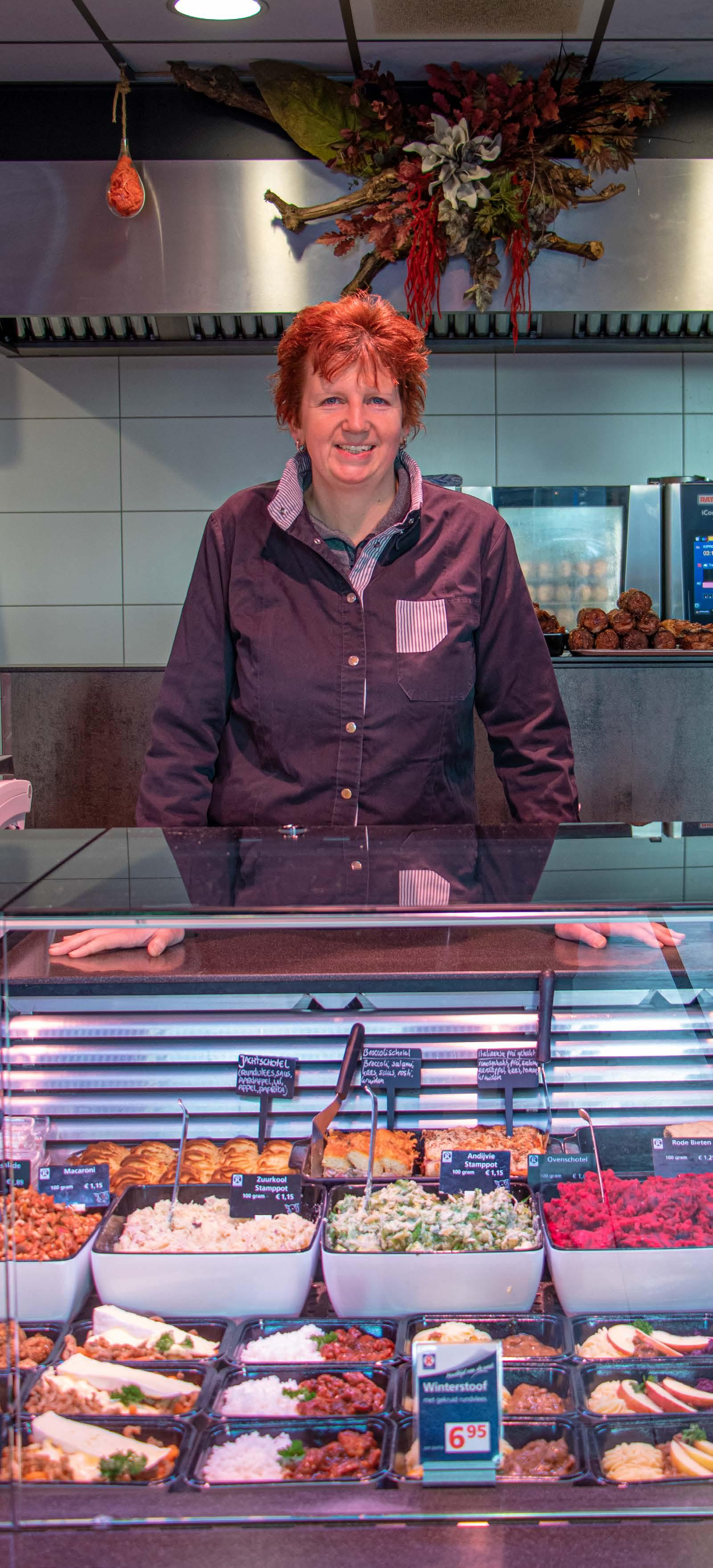 We spreken met ons maaltijdenassortiment diverse doelgroepen aan. De toonbank staat vol met éénpersoonsbakjes en grote bakken waar we uit scheppen. Onze oudere doelgroep koopt zelfs voor vijf dagen in de week een maaltijd. De jongere consument neemt vaak bij de dagelijkse boodschappen een maaltijd mee die er aantrekkelijk uitziet. Een eerste blik doet verkopen, daarom focussen we ons op de presentatie. Dat betekent de grote bakken goed volhouden en de éénpersoonsbakjes garneren. Geen kwakje puree, maar met een spuitzak en de finishing touch: een blaadje peterselie of een slice tomaat. Kleur doet nu eenmaal goed voor het oog.