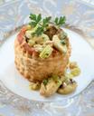 4. Vet een ovenschaal in met de rest van de boter en leg hierin dakpansgewijs de plakjes aardappel en maak laagjes afgewisseld met het paddenstoelenmengsel.