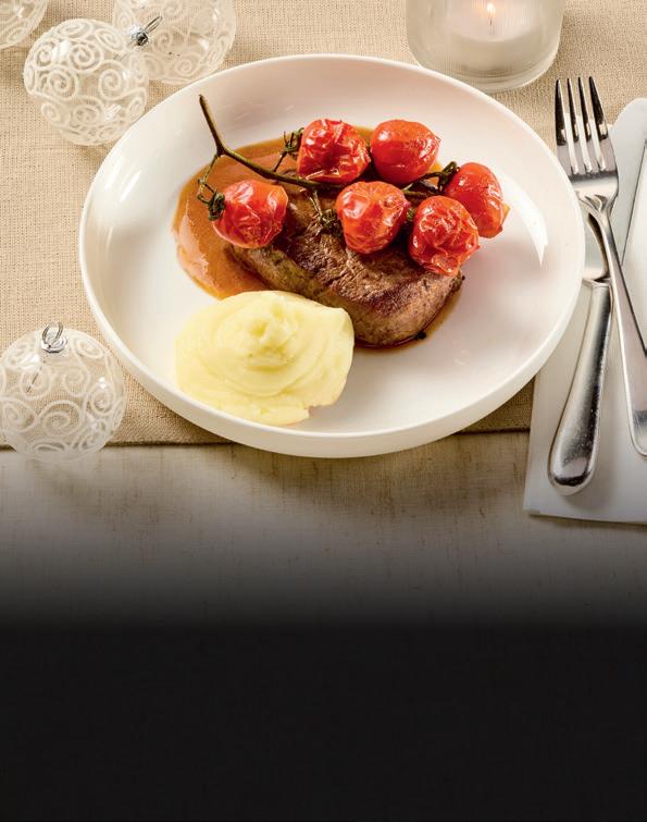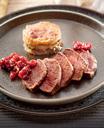 28 Hertenbiefstuk met aardappel-paddenstoelen-gratin en cranberrycompote