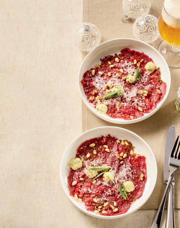 11 Carpaccio met pecorino, mosterd-dragonmayonaise en roggenbrood-crumble