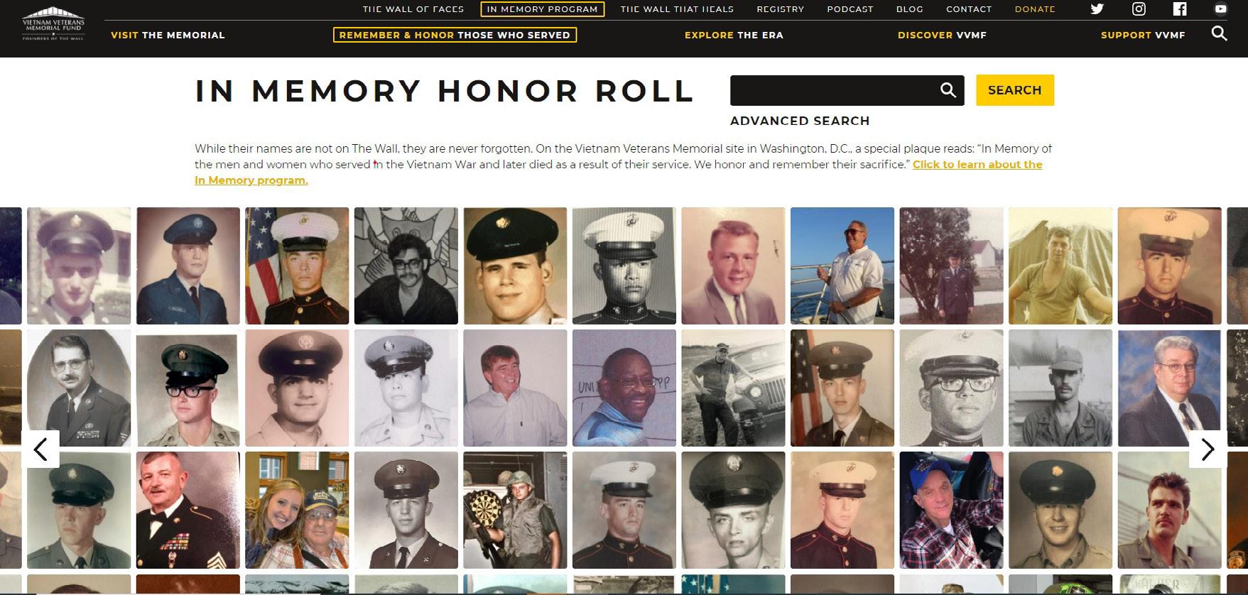 The In Memory program has honored more than 5,600 veterans. The In Memory Honor Roll has a remembrance page for each veteran and can be seen online at www.vvmf.org/honor-roll.