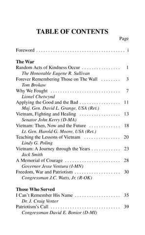 TABLE OF CONTENTS Page Foreword . . . . . . . . . . . . . . . . . . . . . . . . . . . . . . . . . . . . . i The War Random Acts of Kindness Occur . . . . . . . . . . . . . . . . The Honorable Eugene R. Sullivan Forever Remembering Those on The Wall . . . . . . . . Tom Brokaw Why We Fought . . . . . . . . . . . . . . . . . . . . . . . . . . . . . Lionel Chetwynd Applying the Good and the Bad . . . . . . . . . . . . . . . . . Maj. Gen. David L. Grange, USA (Ret.) Vietnam, Fighting and Healing . . . . . . . . . . . . . . . . . Senator John Kerry (D-MA) Vietnam: Then, Now and the Future . . . . . . . . . . . . . Lt. Gen. Harold G. Moore, USA (Ret.) Teaching the Lessons of Vietnam . . . . . . . . . . . . . . . Lindy G. Poling Vietnam: A Journey through the Years . . . . . . . . . . . . Jack Smith A Memorial of Courage . . . . . . . . . . . . . . . . . . . . . . . Governor Jesse Ventura (I-MN) Freedom, War and Patriotism . . . . . . . . . . . . . . . . . . . Congressman J.C. Watts, Jr. (R-OK)