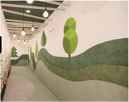 PLAYROOM ENTRY CORRIDOR WITH GREEN CARPET AS WAYFINDER, ACTIVITY AND 3D WALL PANELS