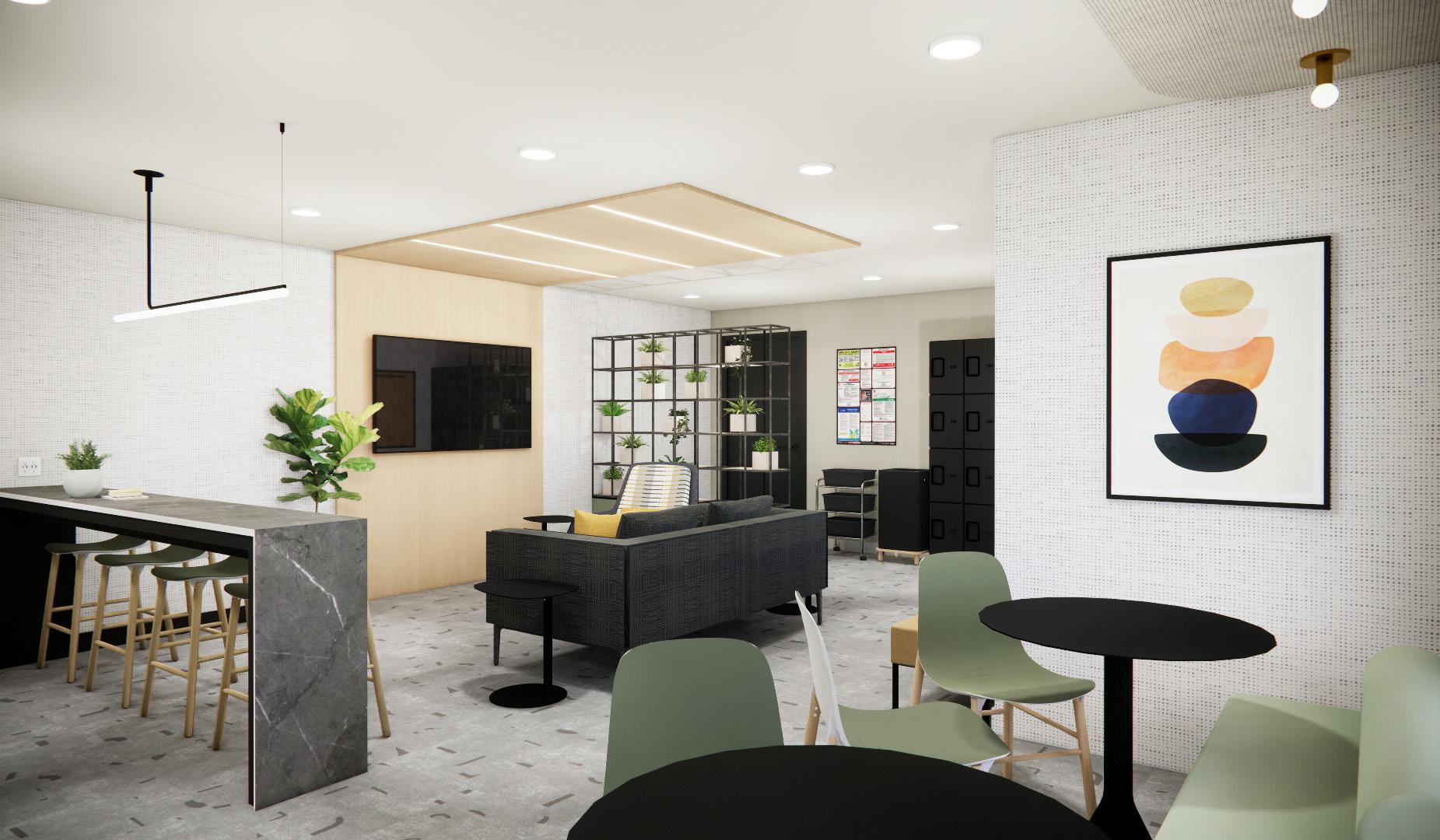 EMPLOYEE BREAKROOM WITH VARIOUS SEATING AREAS