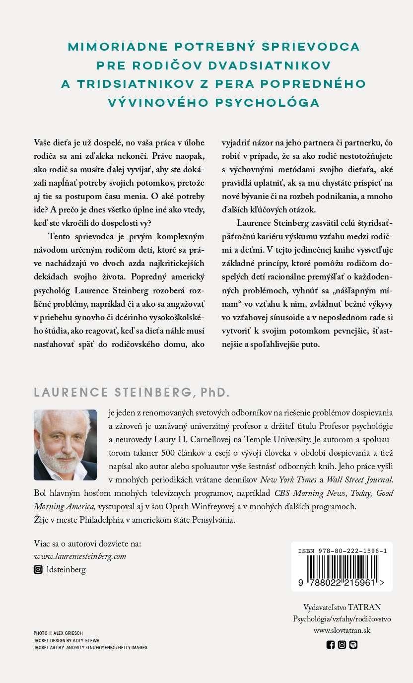 Zhruba 65 miliónov rodičov v Spojených štátoch má dnes aspoň jedno dieťa, ktoré spadá do generácie dvadsiatnikov a tridsiatnikov. Aj rodičia dospelých detí však niekedy potrebujú rady, odporúčania, povzbudenie a nasmerovanie, rovnako ako v iných životných obdobiach. Ako deti postupne starnú, ich nároky na rodičov sa menia, rozličné problémy a výzvy však zostávajú. Či už sa našim deťom darí alebo nedarí, neprestávame byť rodičmi a nejasnosti, ktoré so sebou rodičovstvo do života prináša, z obzoru nikdy nezmiznú. Možno ste sa nazdávali, že najťažšia etapa rodičovstva sa skončila spolu s obdobím dospievania, no zisťujete, že byť rodičom dospelého dieťaťa je tiež náročné, iba iným spôsobom. Niektorí rodičia túto etapu rodičovstva dokonca považujú za náročnejšiu než etapu dospievania.