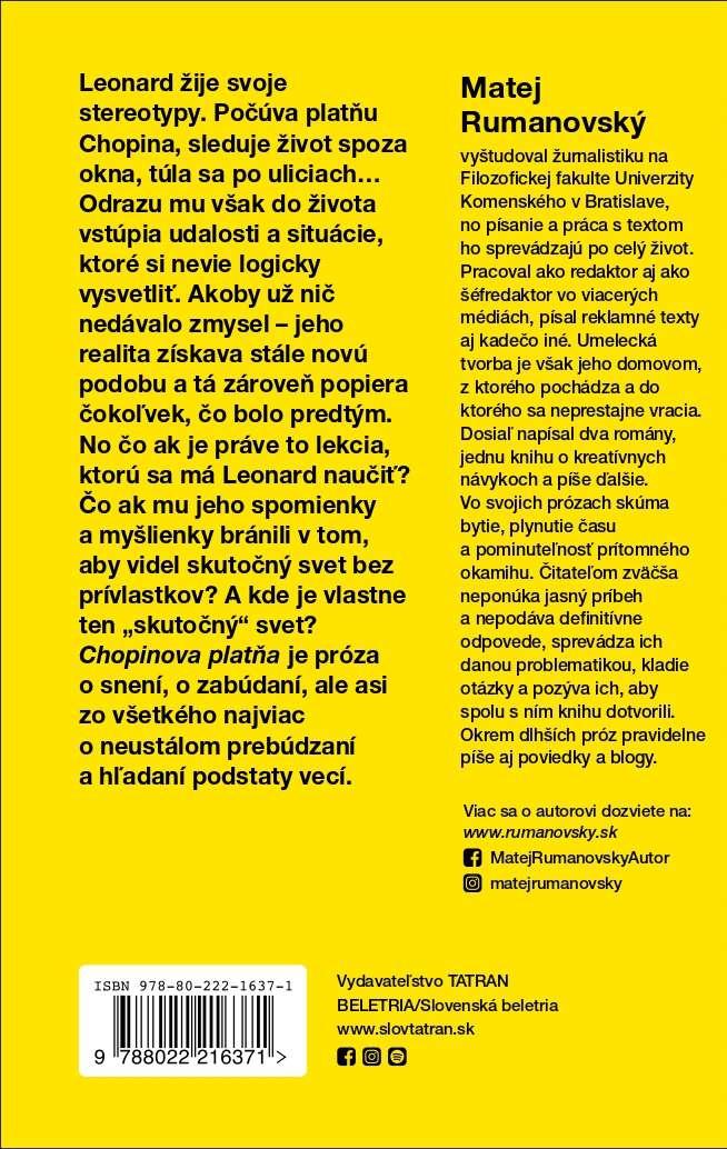 Pochopiteľne, nešlo iba o gramofón ako taký, teda o nečinný stroj, ktorý by Leonarda prinútil popíjať kávu v obývačke namiesto kuchyne. Hneď ako uložil tácku na stolík, pobral sa k polici s vinylovými platňami, z ktorej už tradične vybral dolámaný obal s bielymi okrajmi a z neho čiernu platňu Chopinových Nocturnes, ktoré mu jej prostredníctvom už roky hrával poľsko-americký klavirista Arthur Rubinstein. Bolo zrejmé, že túto platňu počúval Leonard zo všetkých najradšej – naznačoval to tak fyzický stav obalu, ako i stav samotnej platne, ktorá už, skrátka, nemohla podávať výkon ako nová. Zvuk preto nebol ani čistý, ani taký poetický ako Chopinova pôvodná tvorba, Leonard však od prvého počutia nepostrehol zmenu. Tie skladby poznal už naspamäť (aspoň si to myslel) a to, čo by počul niekto nezainteresovaný, nezodpovedalo tomu, čo počul on. Je to, ako keď rodičom rastie pred očami dieťa, ktoré sa im zdá stále rovnako „malé“, no až niekto zvonku, kto ho zopár mesiacov nevidel, dokáže povedať, „ako veľmi vyrástlo“ alebo „aké je už veľké“. Možno aj Leonard by zostal nakoniec prekvapený, keby počul Chopinovu skladbu z cédečka alebo z novej platne, kde by oné praskania a hluché miesta nahradil odrazu čistý a nový tón.