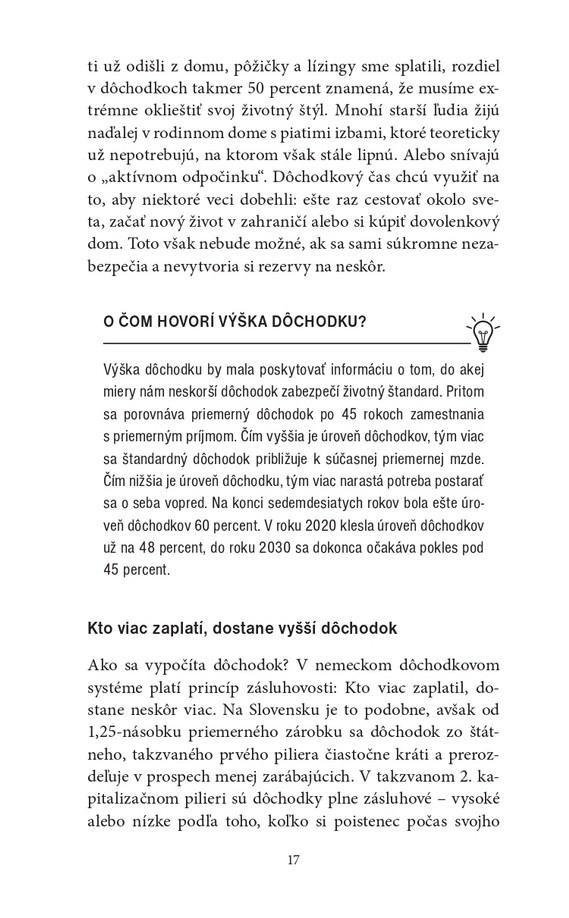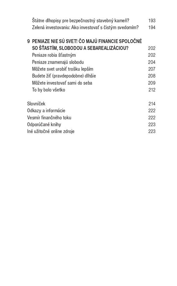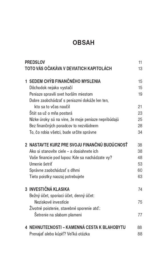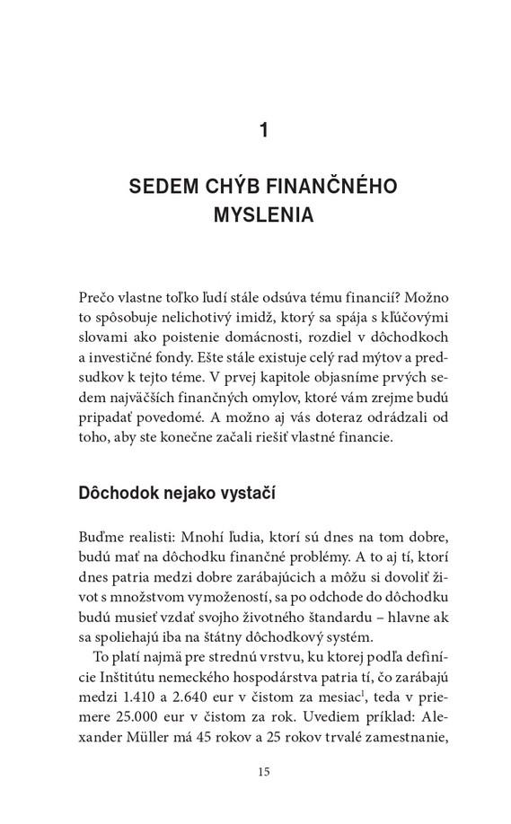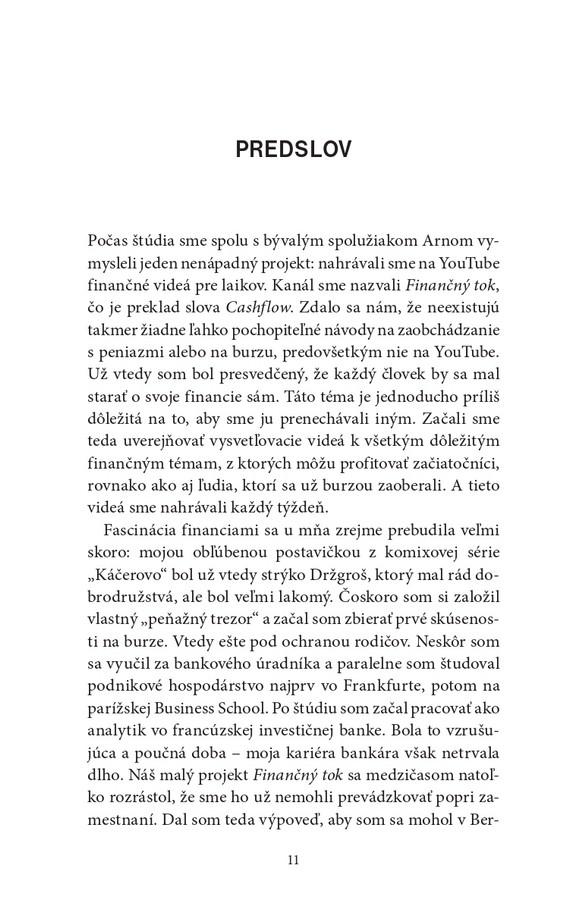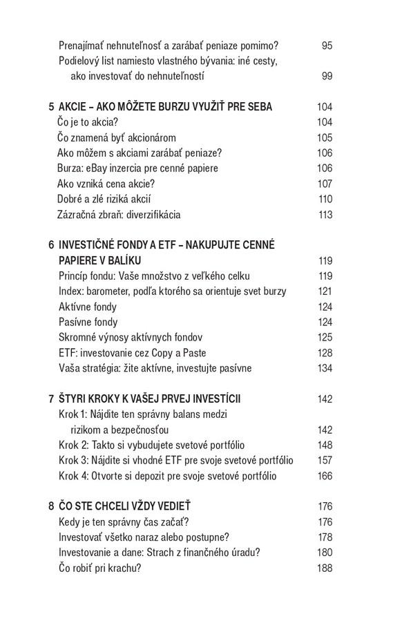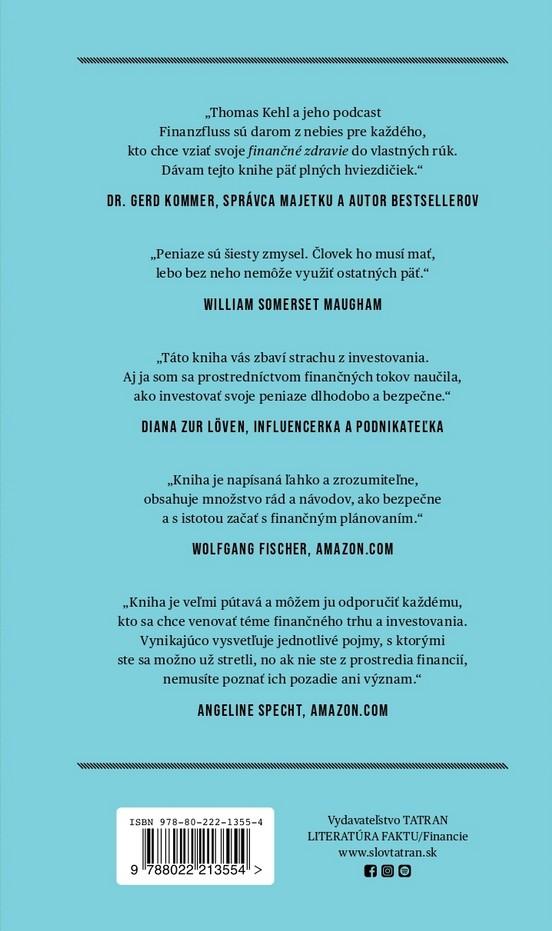 Kniha Thomasa Kehla je určená predovšetkým ľuďom, ktorí sa začínajú venovať financiám. Je to jediná kniha, ktorú treba prečítať, aby ste získali základy a začali pasívne investovať. Autor v prvej kapitole vymenúva a vysvetľuje sedem najčastejších chýb pri uvažovaní o financiách. Stručne povedané, veľa z toho je len chyba v uvažovaní, no nemala by vám brániť správne investovať. Kniha sa venuje aj téme nehnuteľností, zvažuje, čo je výhodnejšie – prenájom na celý život alebo kúpa domu a splácanie pôžičky. Zaujímavo a podrobne vysvetľuje aj investovanie do akcií a práve vďaka fondom ETF je kanál finančných tokov taký mohutný a populárny ako dnes. Thomas Kehl ukazuje a vysvetľuje cestu k nášmu vlastnému svetovému portfóliu. Ak sa aj hneď nepustíte do podnikania v oblasti financií, veľa sa dozviete o svete, ktorý sa vám doteraz zdal nepochopiteľný a tajomný.