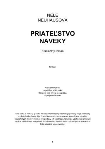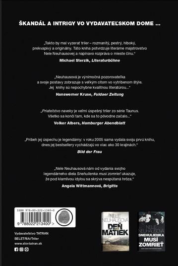Nele Neuhausová dokáže čitateľa okamžite zaujať a vtiahnuť do deja. Zmizne programová manažérka známeho literárneho vydavateľstva vo Frankfurte. Vyšetrovatelia pri pátraní narazia na staré tajomstvá dobrých priateľov a ešte lepších nepriateľov. To všetko sa odohráva vo svete veľkých autorov, vydavateľstva a vydavateľskej rodiny.