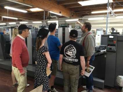 In de bezoekersruimte vertelde Tom, onze gids, wat er daar allemaal kan gedrukt worden.