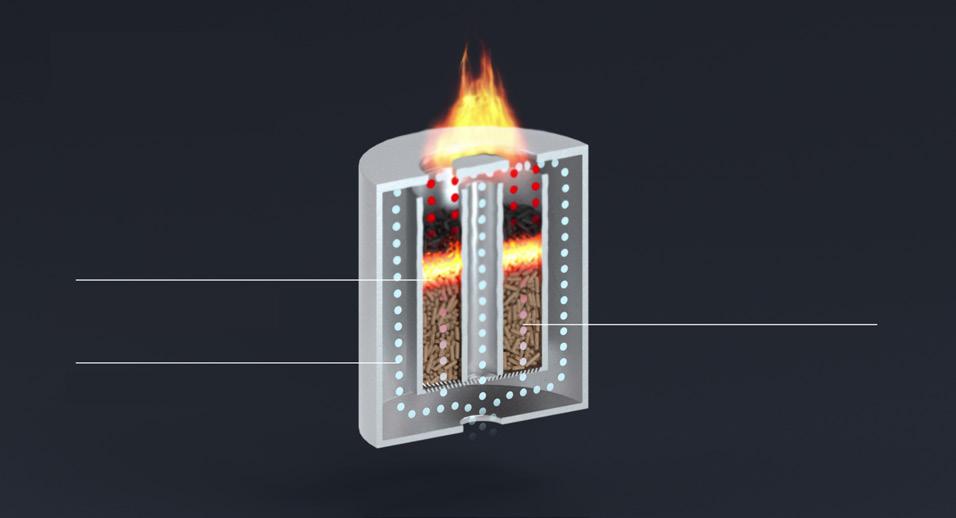 Die patentierte, stromlose Technik bietet eine saubere Verbrennung, eine sehr hohe Effizienz und einen minimalen Pelletverbrauch.