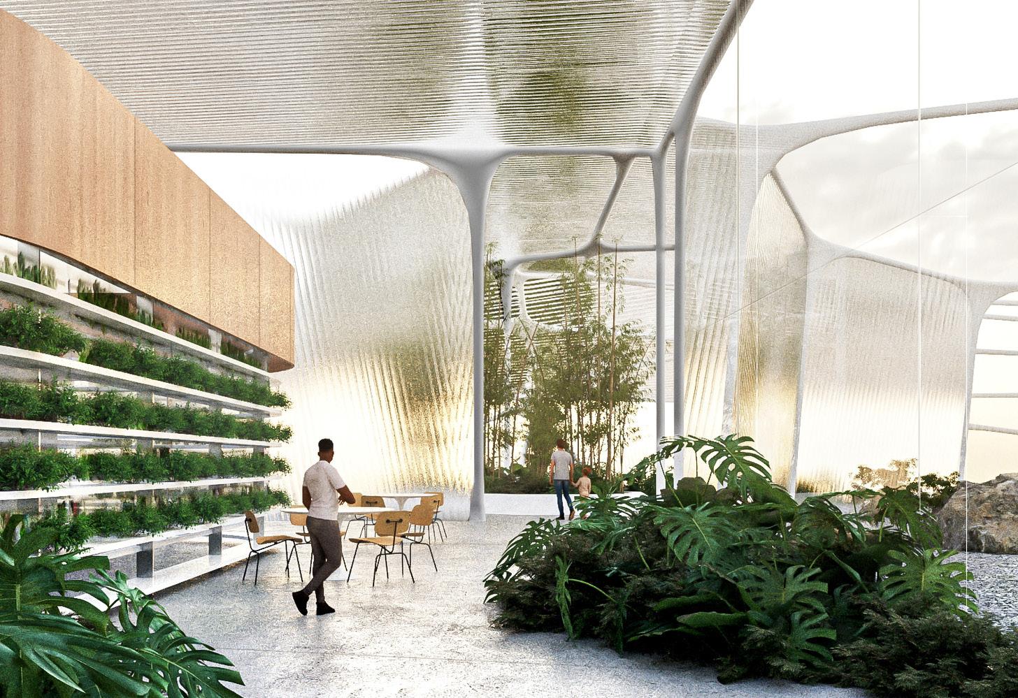 “We were inspired by the potential to embed food resilience, clean energy, and community infrastructure—like an integrated farmers’ market— within the digital backbone of the city,” MacDonald explains the design inspiration for such a data center.