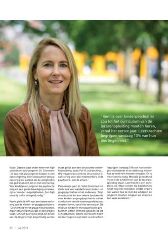 staat gelijk aan een structurele onder financiering, zoals For-K, outreaching … Wij vragen een correcte structurele financiering voor alle medewerkers in de psychiatrie, ook de artsen.” Persoonlijk ijvert dr. Sofie Crommen ten slotte ook voor aandacht voor kinder- en jeugdpsychiatrie in het onderwijs. “Mijn standpunt is dat een zekere basiskennis over kinder- en jeugdpsychiatrie tot het curriculum van de lerarenopleiding zou moeten horen, vanaf het eerste jaar. De meeste kinderen met psychische problemen zitten immers gewoon op de schoolbanken. Iedere leerkracht heeft die leerlingen in zijn klas! Leerkrachten