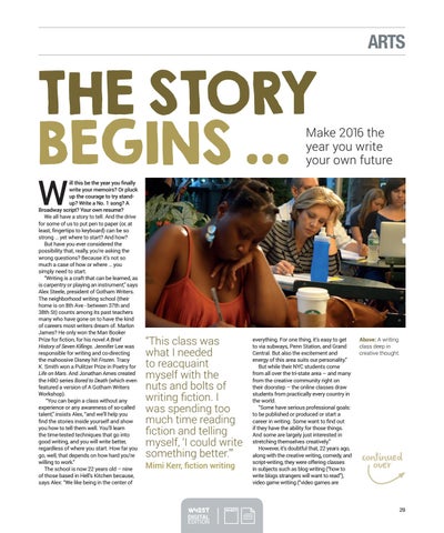 ill this be the year you finally write your memoirs? Or pluck up the courage to try standup? Write a No. 1 song? A Broadway script? Your own resume? We all have a story to tell. And the drive for some of us to put pen to paper (or, at least, fingertips to keyboard) can be so strong … yet where to start? And how? But have you ever considered the possibility that, really, you’re asking the wrong questions? Because it’s not so much a case of how or where … you simply need to start. “Writing is a craft that can be learned, as is carpentry or playing an instrument,” says Alex Steele, president of Gotham Writers. The neighborhood writing school (their home is on 8th Ave - between 37th and 38th St) counts among its past teachers many who have gone on to have the kind of careers most writers dream of. Marlon James? He only won the Man Booker Prize for fiction, for his novel A Brief History of Seven Killings. Jennifer Lee was responsible for writing and co-directing the mahoosive Disney hit Frozen. Tracy K. Smith won a Pulitzer Prize in Poetry for Life on Mars. And Jonathan Ames created the HBO series Bored to Death (which even featured a version of A Gotham Writers Workshop). “You can begin a class without any experience or any awareness of so-called talent,” insists Alex, “and we’ll help you find the stories inside yourself and show you how to tell them well. You’ll learn the time-tested techniques that go into good writing, and you will write better, regardless of where you start. How far you go, well, that depends on how hard you’re willing to work.” The school is now 22 years old – nine of those based in Hell’s Kitchen because, says Alex: “We like being in the center of