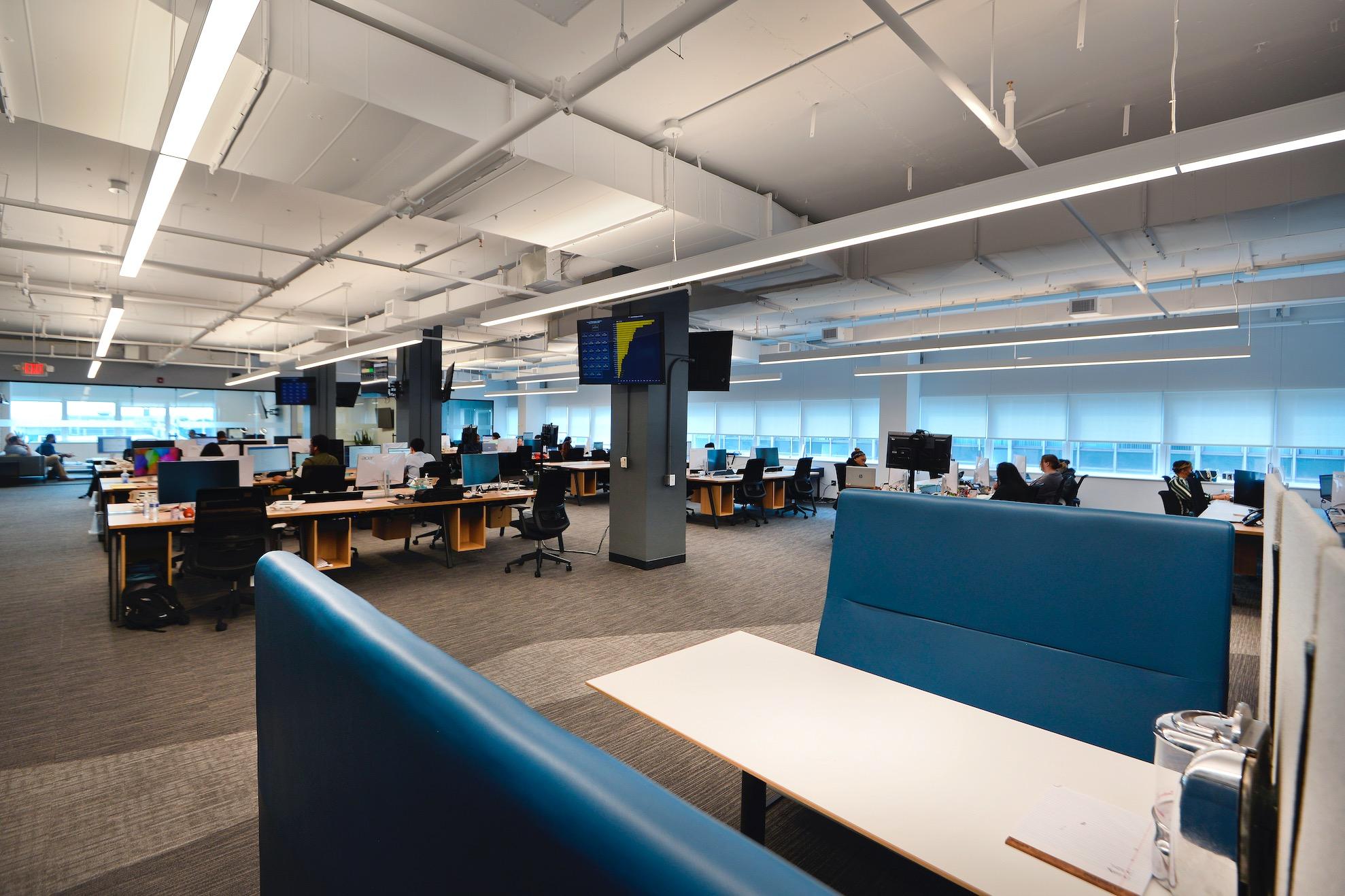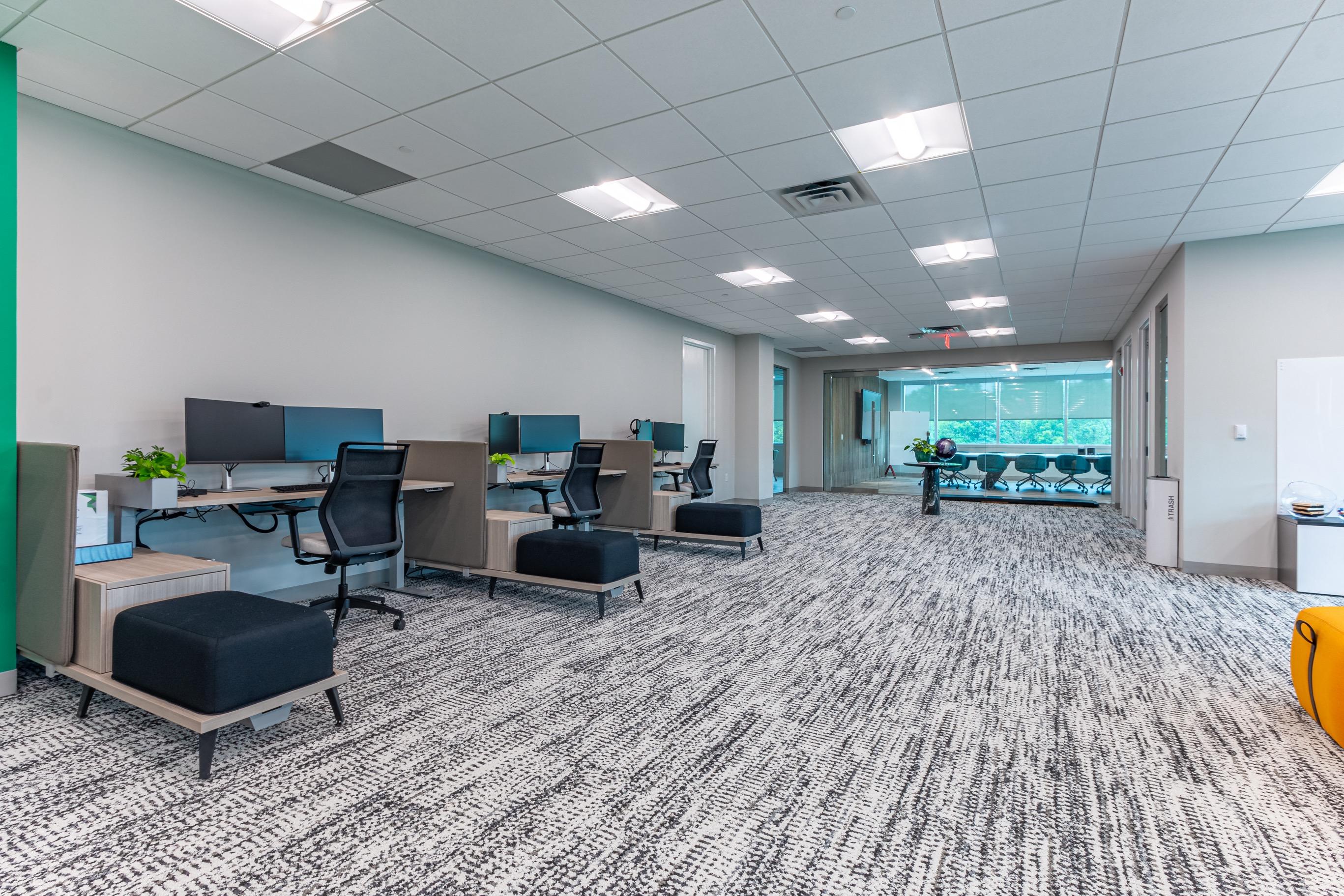 Pods and small interaction rooms foster a workflow where staff can perform heads - down personal work at their desk and transition to more collaborative environments when their work demands.