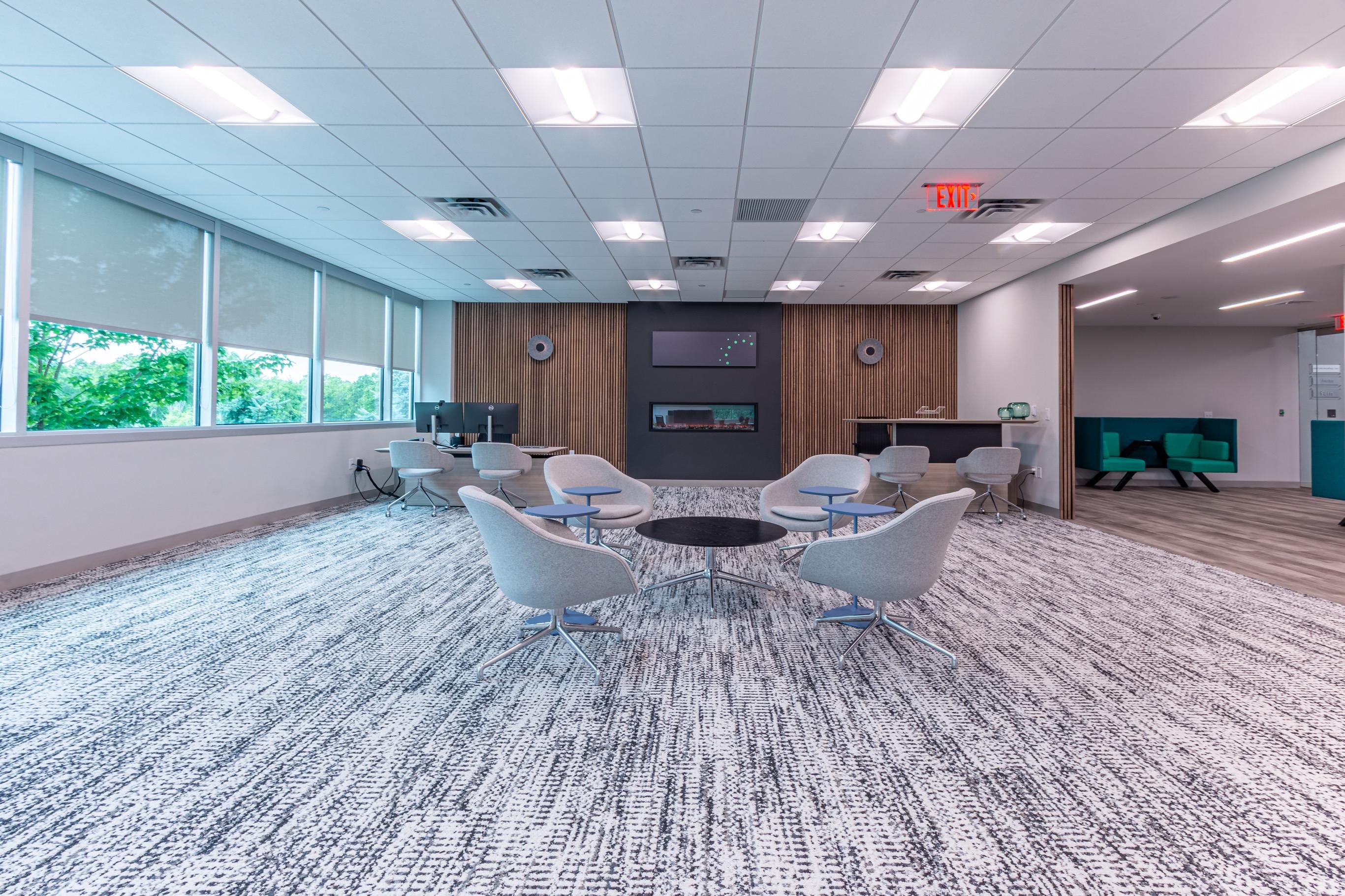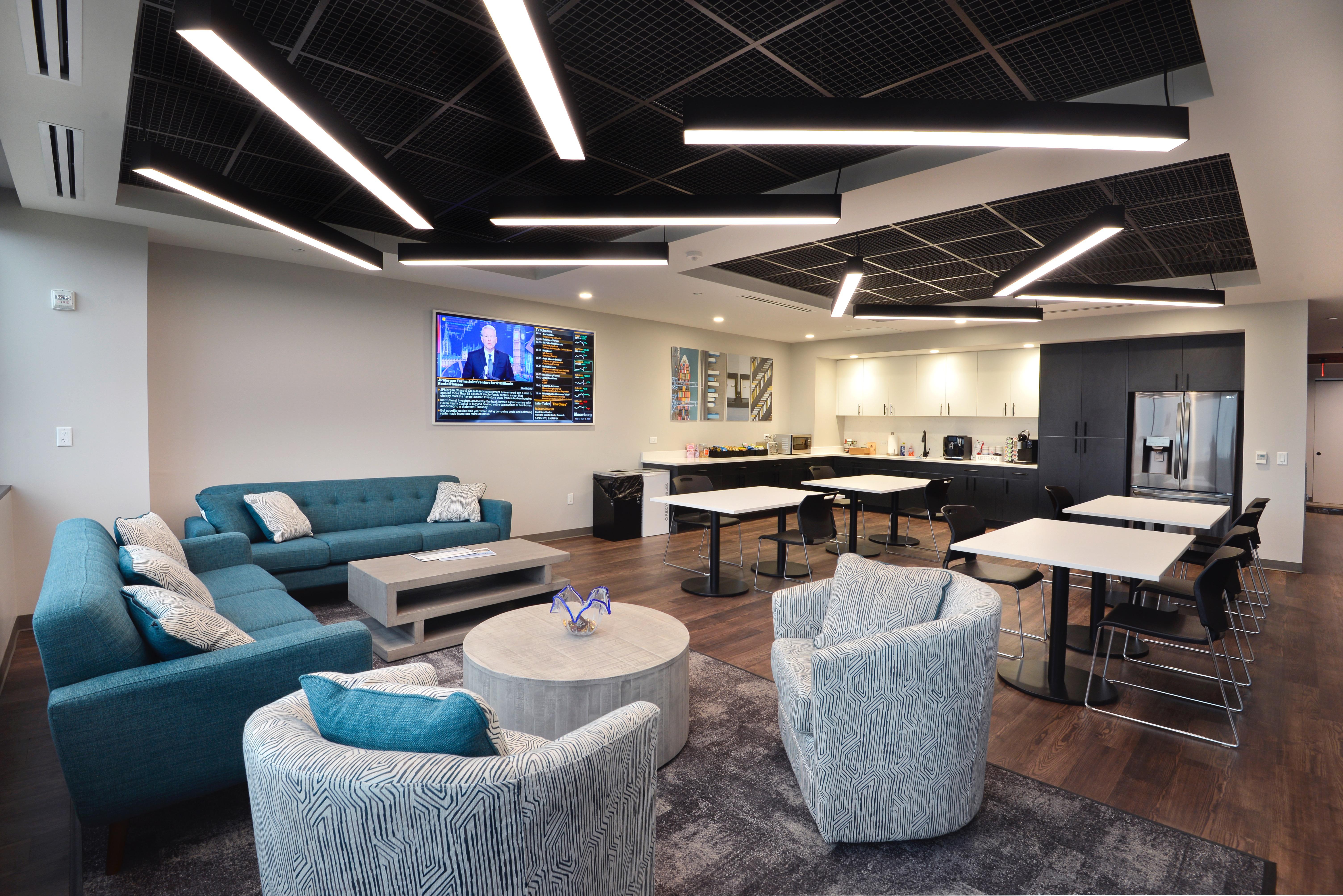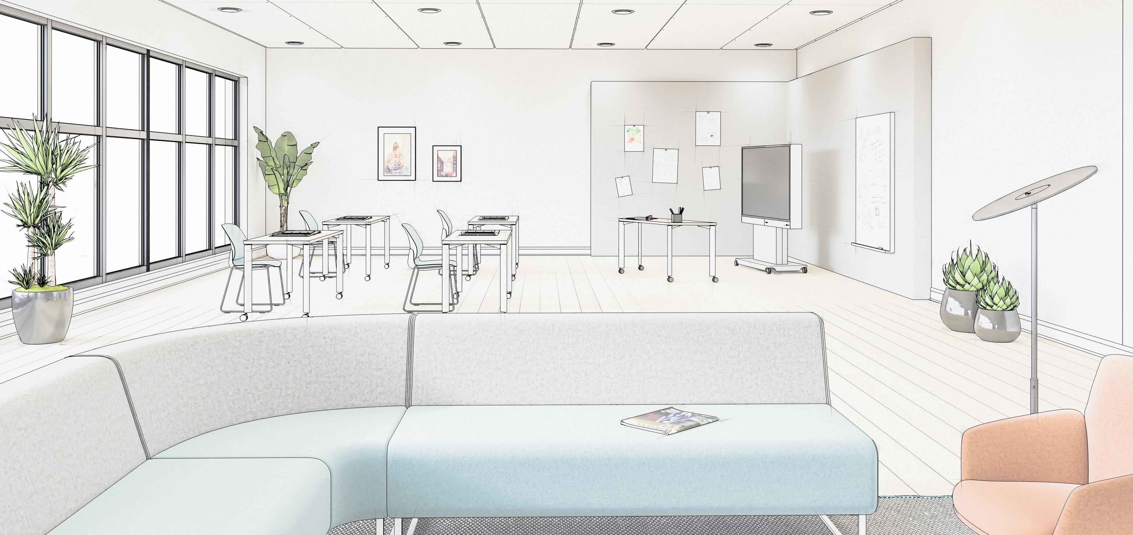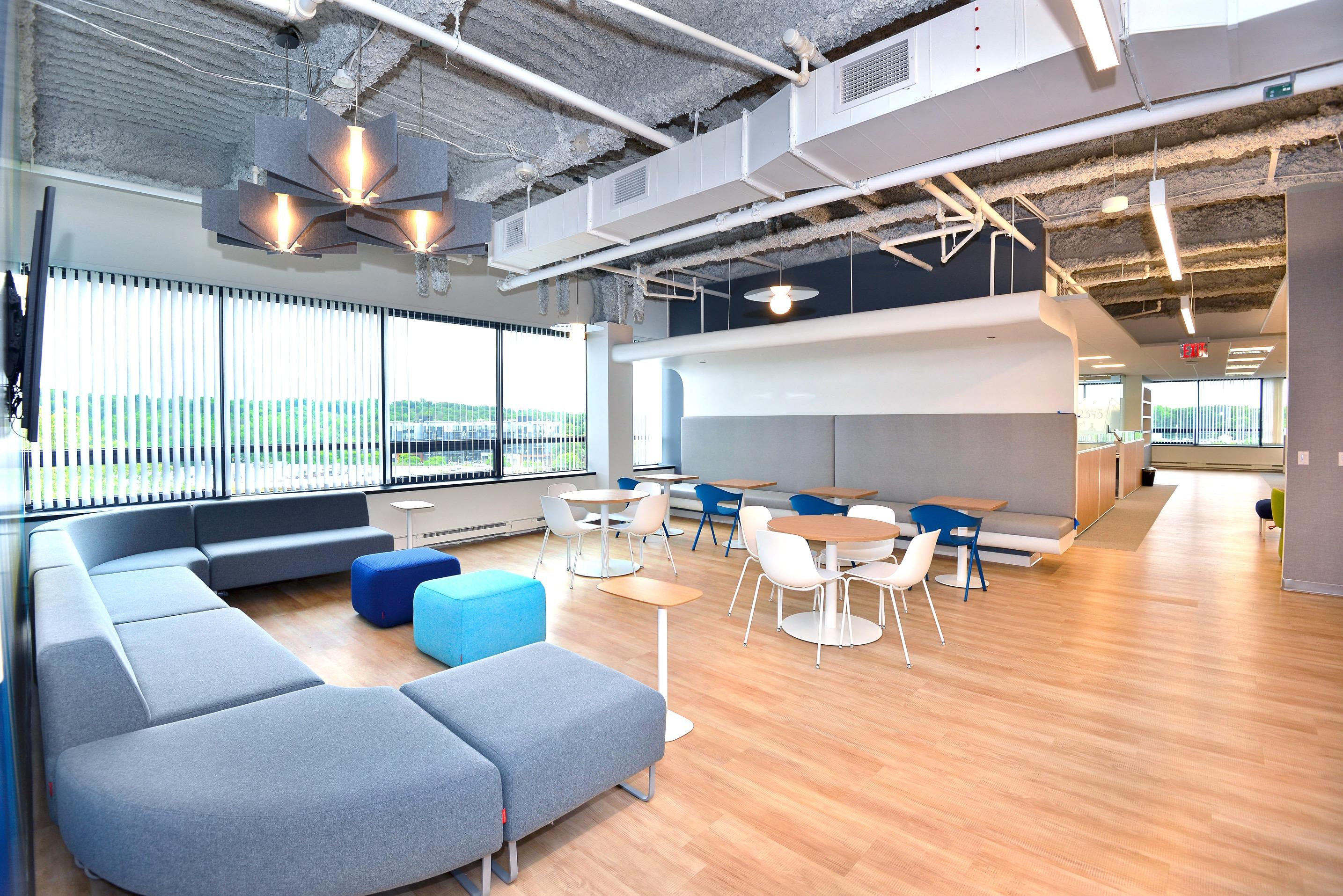 • Modular lounge furnishings that allow dual use of break spaces for small group collaboration or town hall events