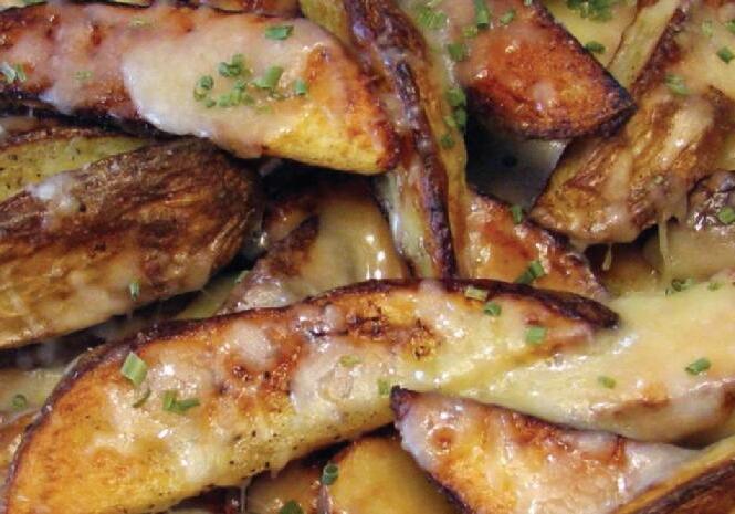 10. Arrange the 24 potato wedges in rows cut-side up, peel-side down on a baking sheet.