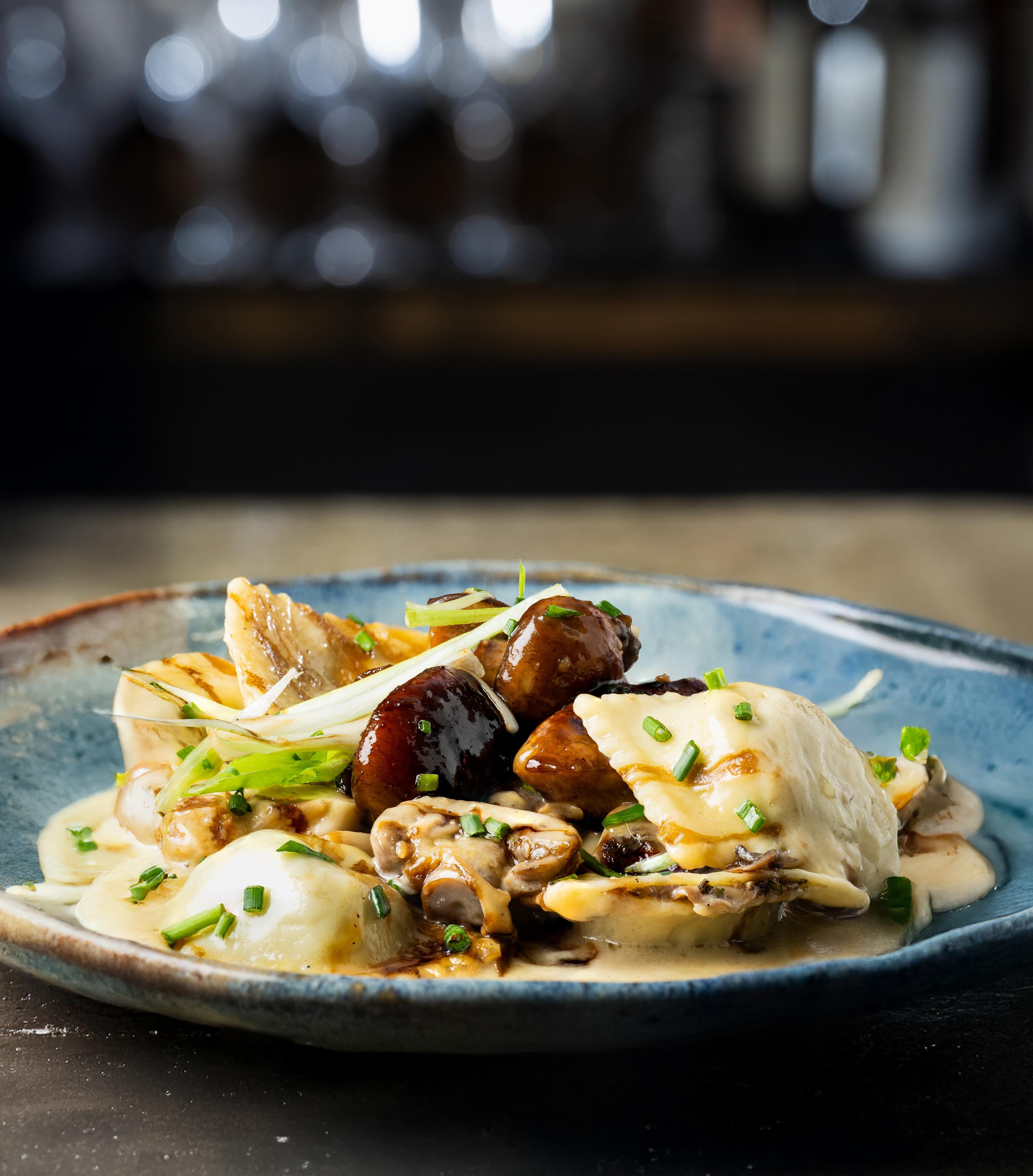 “I’ve had that in all the restaurants I’ve created — we’ve always featured mushrooms and the mushroom ravioli,” he says, then adds with a laugh, “There might be people marching out front if we didn’t have those on the menu when they came.”