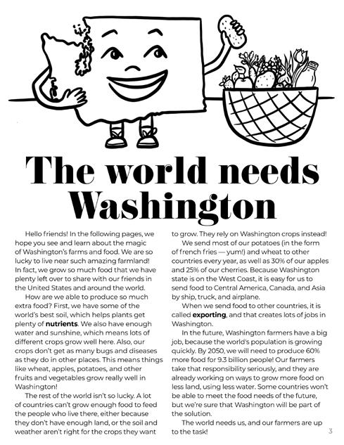 While some students will be familiar with Washington farms, produce, and agriculture, others may not know that many of the fruits and vegetables they eat are grown right here in our state! Before you begin working through the activity book, ask the kids if they’ve ever been on a farm. Ask them what they saw growing there, and what their favorite fruits and vegetables are.