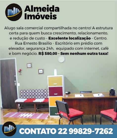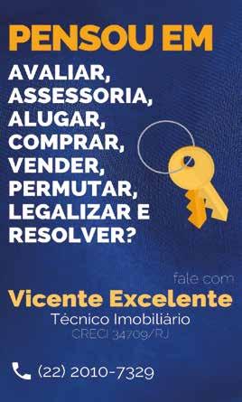 R www.jornalcasatudonovamarca.com.br jornalcasatudo@gmail.com nova marcaOutubro 2022 • 40 anos de tradição • 22 99263.1538 / 21 98156-2335 • R$ 2.00 SLVENDA200 l CENTRO l SALA www.vicentecorretordeimoveis.com.br vicente34709@hotmail.com 22 2010-7329 22 99947-0935 22 99278-2204 DE R$180 MIL POR R$160 MIL GRANDE OPORTUNIDADE Sala comercial - sala linear com 11 tomadas, interfone, banheiro, divisória para recepção, portas de blindex e madeira. 10.00 m comprimento x 4 .OO m de largura, frente, sol da manhã em todas as estações. Rua Sete de Setembro, 2o andar, condomínio ( água incluso + IPTU + taxa de incêndio anual + foto anual). Economize com a conta de água com POÇOS E NASCENTES LICENCIAMENTOS (LI, LP, LO, LAS) REGULARIZAÇÃO DE LOTEAMENTOS LAUDOS AMBIENTAIS E GEOTÉCNICOS Mineração - areal, água mineral, granito, etc. 40 anos de Experciência Whatsapp 22 99721-8869 geologopedro@gmail.com ALUGO GALPÃO - ESTRADA FRIBURGO X TERESÓPOLIS - CÓRREGO D’ANTAS AVENIDA MÁRIO DE AZEVEDO AO LADO DA BRASPRESS w22 99961-216O