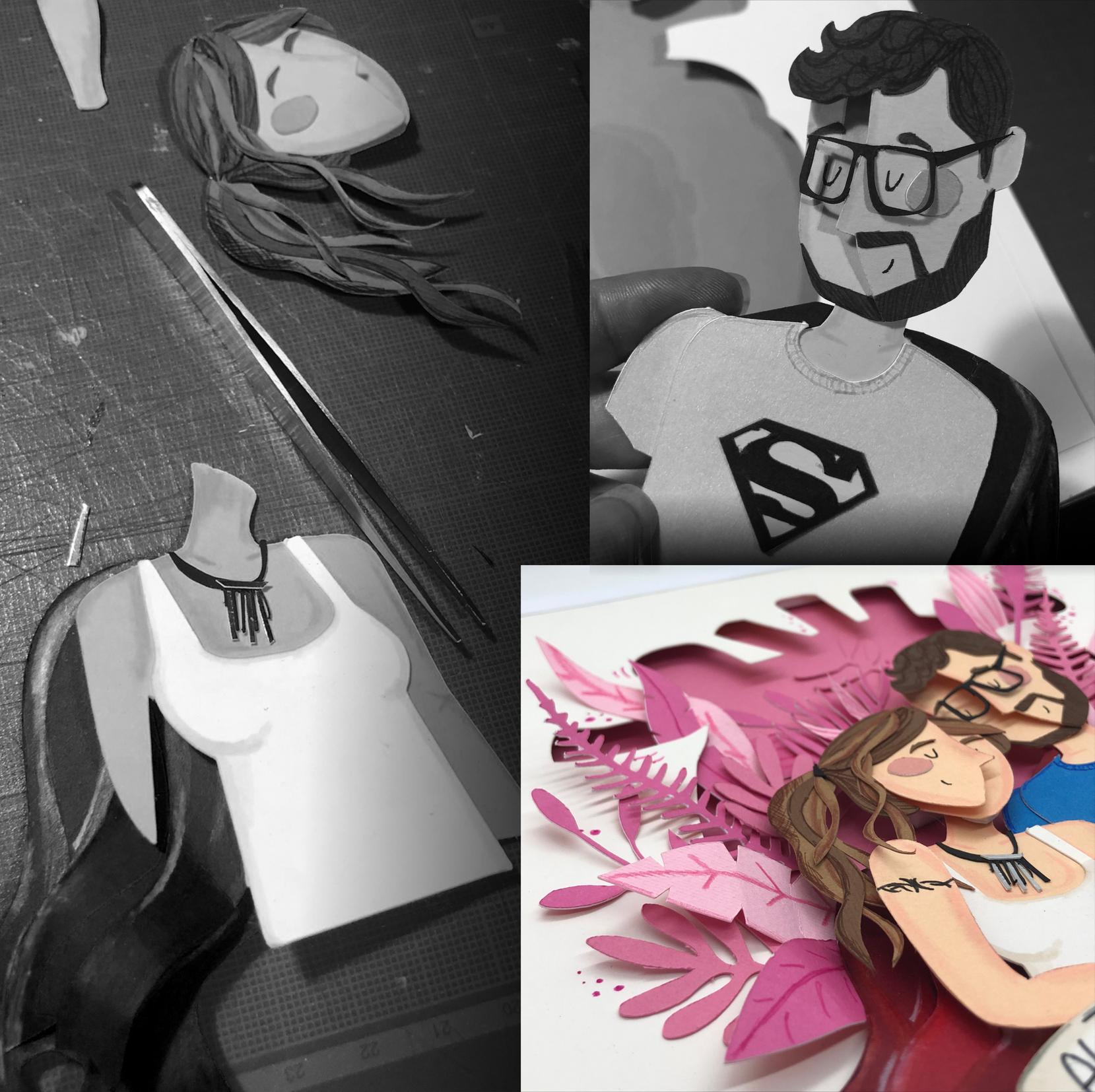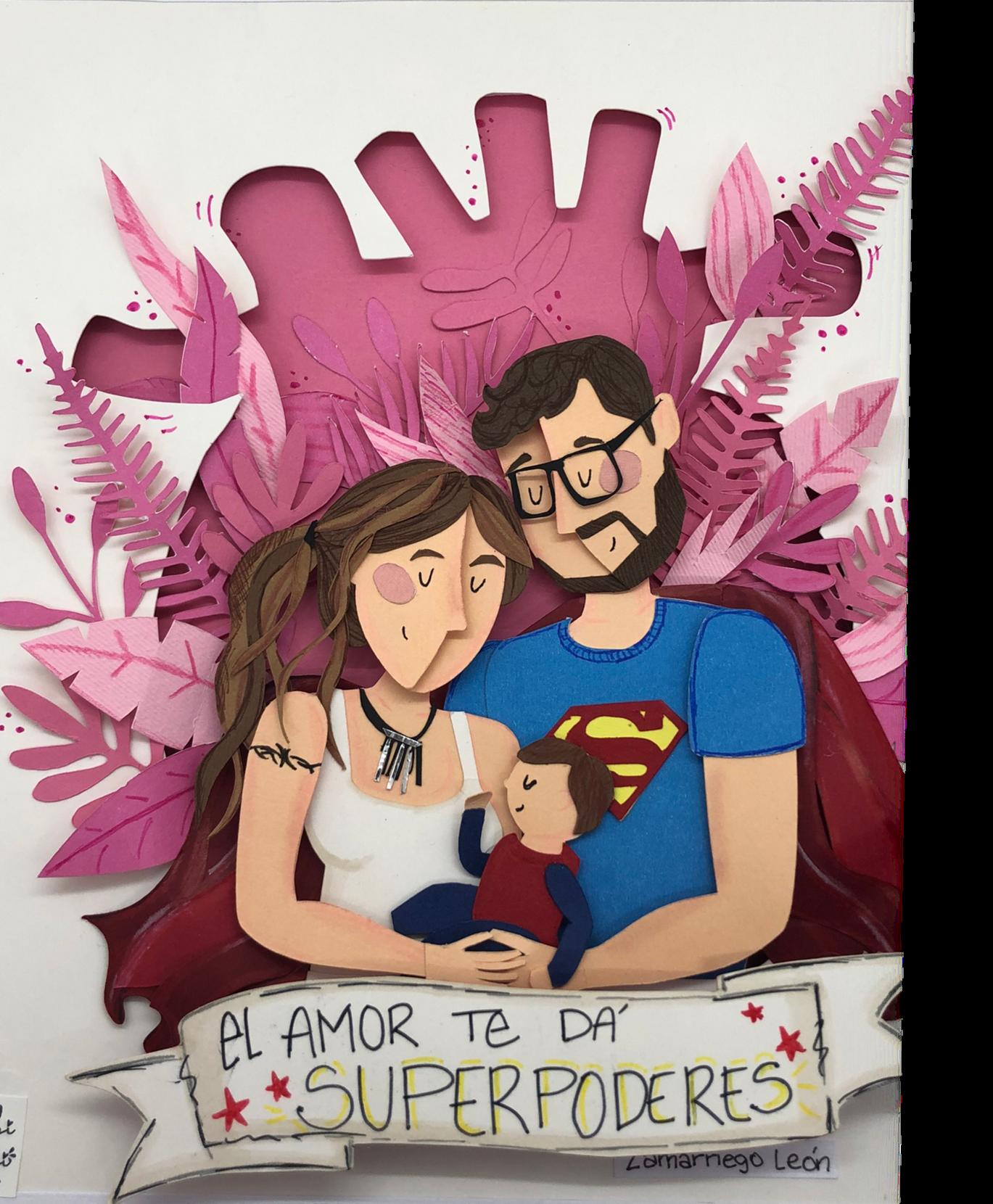 Ilustración familiar hecha a mano. Montaje en capas para dar volumen y crear sombras.