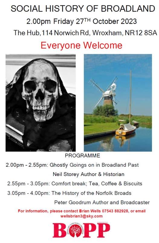 Tues 17th October: AGM followed by Supper and the Trophy Quiz; Ludham Church Room 7pm. Book by 10th October. Weds 1st November: Lunch at the Fur & Feathers, Woodbastwick 12.30pm. Book by 25th October.