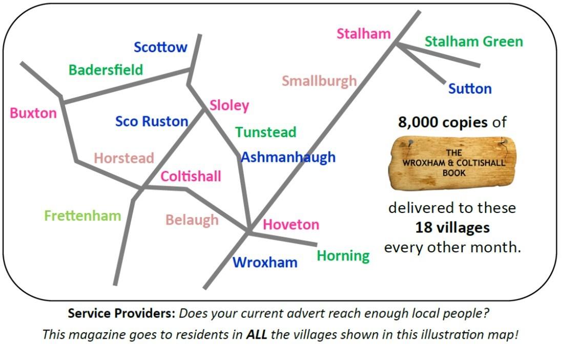 This magazine is one of 8,000 copies delivered to residents & businesses in: Wroxham, Hoveton, Horning, Badersfield, Coltishall, Horstead, Stalham, Stalham Green, Sutton, Tunstead, Frettenham, Scottow, Belaugh, Sco Ruston, Ashmanhaugh, Smallburgh, Sloley & Buxton.
