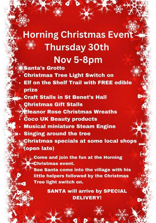 Horning Christmas Event. This will take place on Thursday 30th November 2023 – 5pm- 8pm.