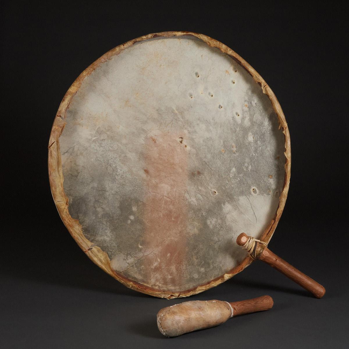 wood, sinew, hide, steel nails drum 31.5 x 23.5 x 2.5 in — 80 x 59.7 x 6.4 cm