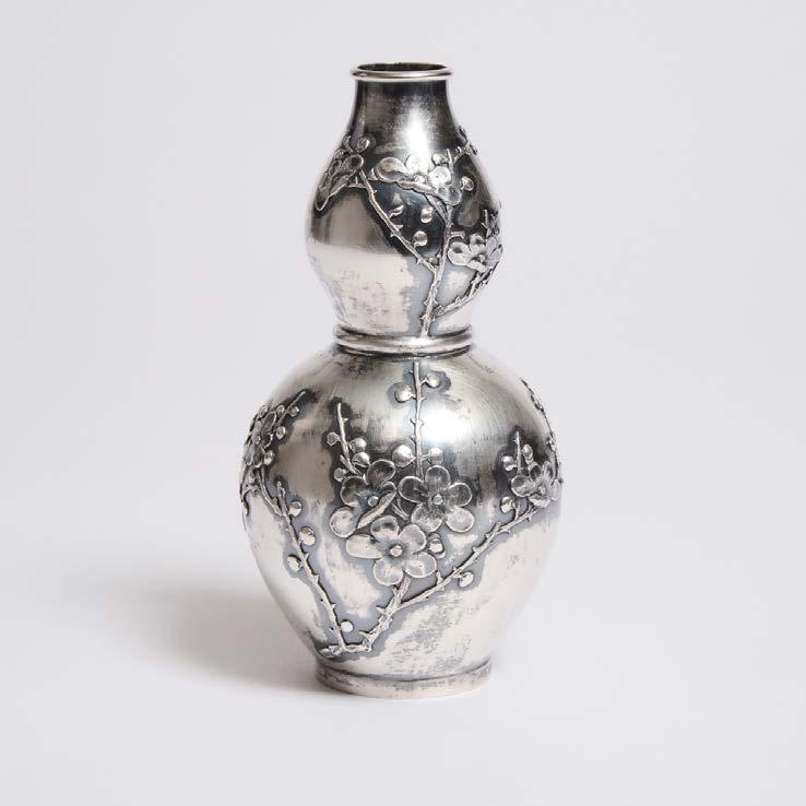 Of slender ovoid form, the mouth and foot mounted with silver and the body worked in silver and gold wire to depict three bu erflies in flight, the base with the Ando Company mark height 8.3 in — 21.2 cm