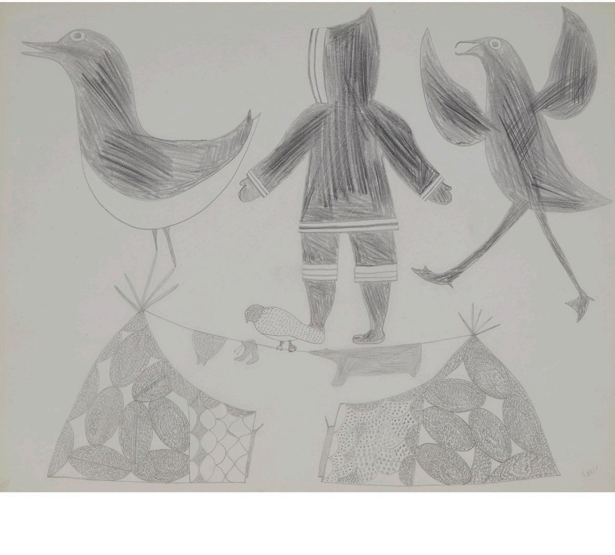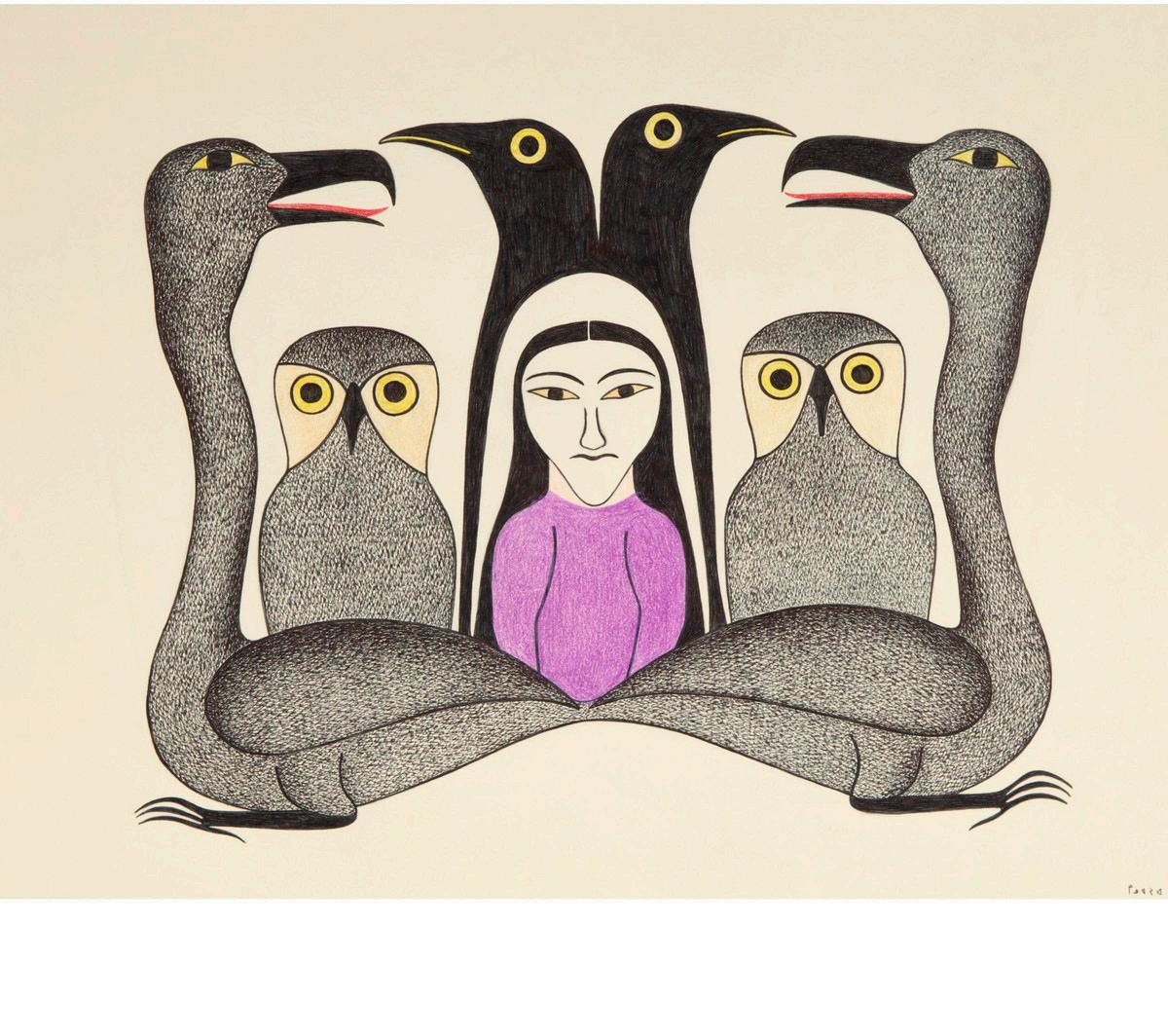 UNTITLED (WOMAN WITH BIRDS) felt-tip drawing; signed in syllabics; embossed with the West Baffin Eskimo Cooperative seal; inscribed verso: “DR050505 / ‘71”; unframed sheet 20 x 26 in — 50.8 x 66 cm
