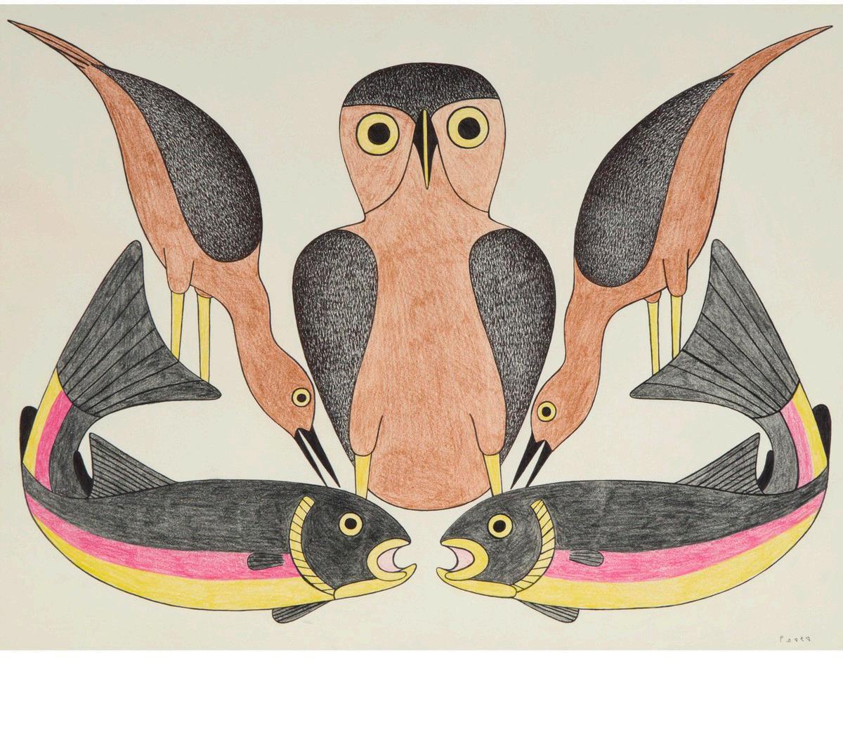 coloured pencil and ink drawing; signed in syllabics; embossed with the West Baffin Eskimo Cooperative chop; inscribed verso: “DR071117 / CD040-2244abd-91/92-03/06 - 50.8 x 66”; unframed sheet 20 x 26 in — 50.8 x 66 cm