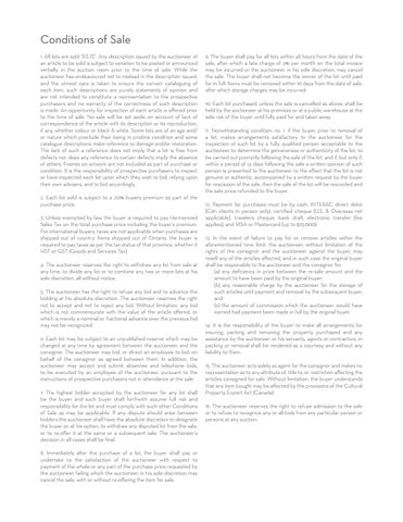 Conditions of Sale 1. All lots are sold “AS IS”. Any description issued by the auctioneer of an article to be sold is subject to variation to be posted or announced verbally in the auction room prior to the time of sale. While the auctioneer has endeavoured not to mislead in the description issued, and the utmost care is taken to ensure the correct cataloguing of each item, such descriptions are purely statements of opinion and are not intended to constitute a representation to the prospective purchasers and no warranty of the correctness of such description is made. An opportunity for inspection of each article is offered prior to the time of sale. No sale will be set aside on account of lack of correspondence of the article with its description or its reproduction, if any, whether colour or black & white. Some lots are of an age and/ or nature which preclude their being in pristine condition and some catalogue descriptions make reference to damage and/or restoration. The lack of such a reference does not imply that a lot is free from defects nor does any reference to certain defects imply the absence of others. Frames on artwork are not included as part of purchase or condition. It is the responsibility of prospective purchasers to inspect or have inspected each lot upon which they wish to bid, relying upon their own advisers, and to bid accordingly. 2. Each lot sold is subject to a 20% buyers premium as part of the purchase price. 3. Unless exempted by law, the buyer is required to pay Harmonized Sales Tax on the total purchase price including the buyer’s premium. For international buyers, taxes are not applicable when purchases are shipped out of country. Items shipped out of Ontario, the buyer is required to pay taxes as per the tax status of that province, whether it HST or GST (Goods and Services Tax). 4. The auctioneer reserves the right to withdraw any lot from sale at any time, to divide any lot or to combine any two or more lots at his sole discretion, all without notice. 5. The auctioneer has the right to refuse any bid and to advance the bidding at his absolute discretion. The auctioneer reserves the right not to accept and not to reject any bid. Without limitation, any bid which is not commensurate with the value of the article offered, or which is merely a nominal or fractional advance over the previous bid may not be recognized. 6. Each lot may be subject to an unpublished reserve which may be changed at any time by agreement between the auctioneer and the consignor. The auctioneer may bid, or direct an employee to bid, on behalf of the consignor as agreed between them. In addition, the auctioneer may accept and submit absentee and telephone bids, to be executed by an employee of the auctioneer, pursuant to the instructions of prospective purchasers not in attendance at the sale. 7. The highest bidder accepted by the auctioneer for any lot shall be the buyer and such buyer shall forthwith assume full risk and responsibility for the lot and must comply with such other Conditions of Sale as may be applicable. If any dispute should arise between bidders the auctioneer shall have the absolute discretion to designate the buyer or, at his option, to withdraw any disputed lot from the sale, or to re-offer it at the same or a subsequent sale. The auctioneer’s decision in all cases shall be final. 8. Immediately after the purchase of a lot, the buyer shall pay or undertake to the satisfaction of the auctioneer with respect to payment of the whole or any part of the purchase price requested by the auctioneer, failing which the auctioneer in his sole discretion may cancel the sale, with or without re-offering the item for sale.