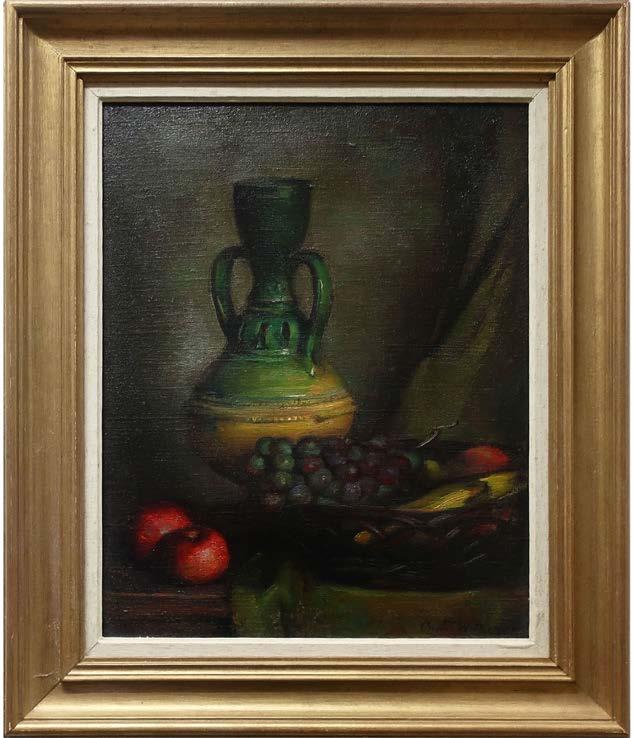 STILL LIFE (ROSES IN A JUG AND LEMON) OIL ON CANVAS BOARD; SIGNED UPPER LEFT; SIGNED VERSO 15.8 x 19.8 in — 40.1 x 50.3 cm