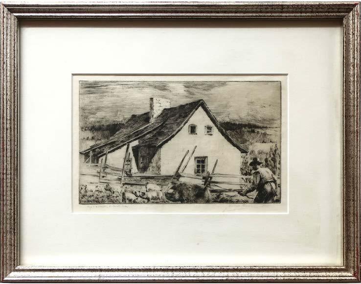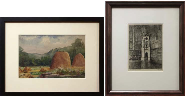 “TALL HAYSTACKS” & “STAIRWAY, GREAT HALL HART HOUSE” (TWO WORKS) FORMERWATERCOLOUR; SIGNED LOWER LEFT (Sight, 7.3” x 11”); LATTER - ETCHING; SIGNED AND TITLED IN PENCIL; TITLED TO GALLERY LABEL (Plate, 7.9” x 5.9”)