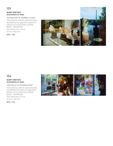 134 BARRY ORETSKY (CANADIAN, B. 1946) “INK WELLS” & “FLOWER SHOP” TWO DIGITAL PRINTS; EACH SIGNED, NUMBERED HC 1/50 & HC 8/50 AND DATED ‘09 IN GOLD PEN LOWER RIGHT - UNFRAMED Each sheet 13 ins x 19 ins; 33 cms x 48.3 cms $120 — 150