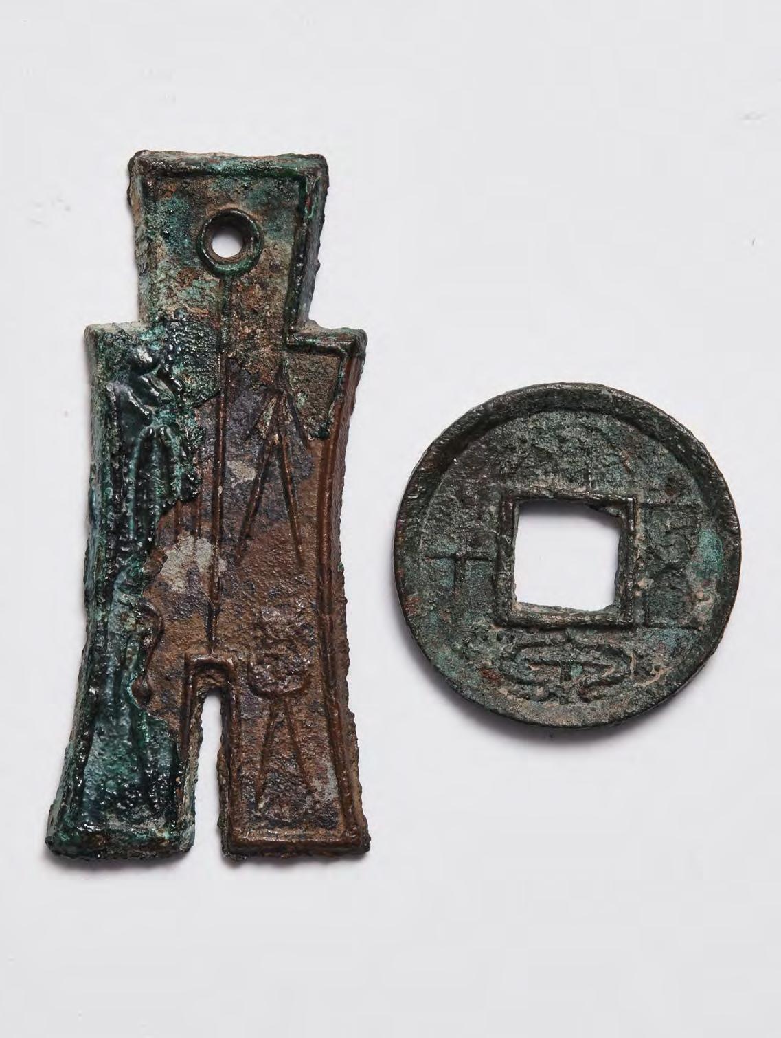 A BRONZE ‘DA BU HUANG QIAN’ SPADE-MONEY COIN, TOGETHER WITH A CIRCULAR ‘DA QUAN WU SHI’ COIN, XIN DYNASTY (AD 9-25)