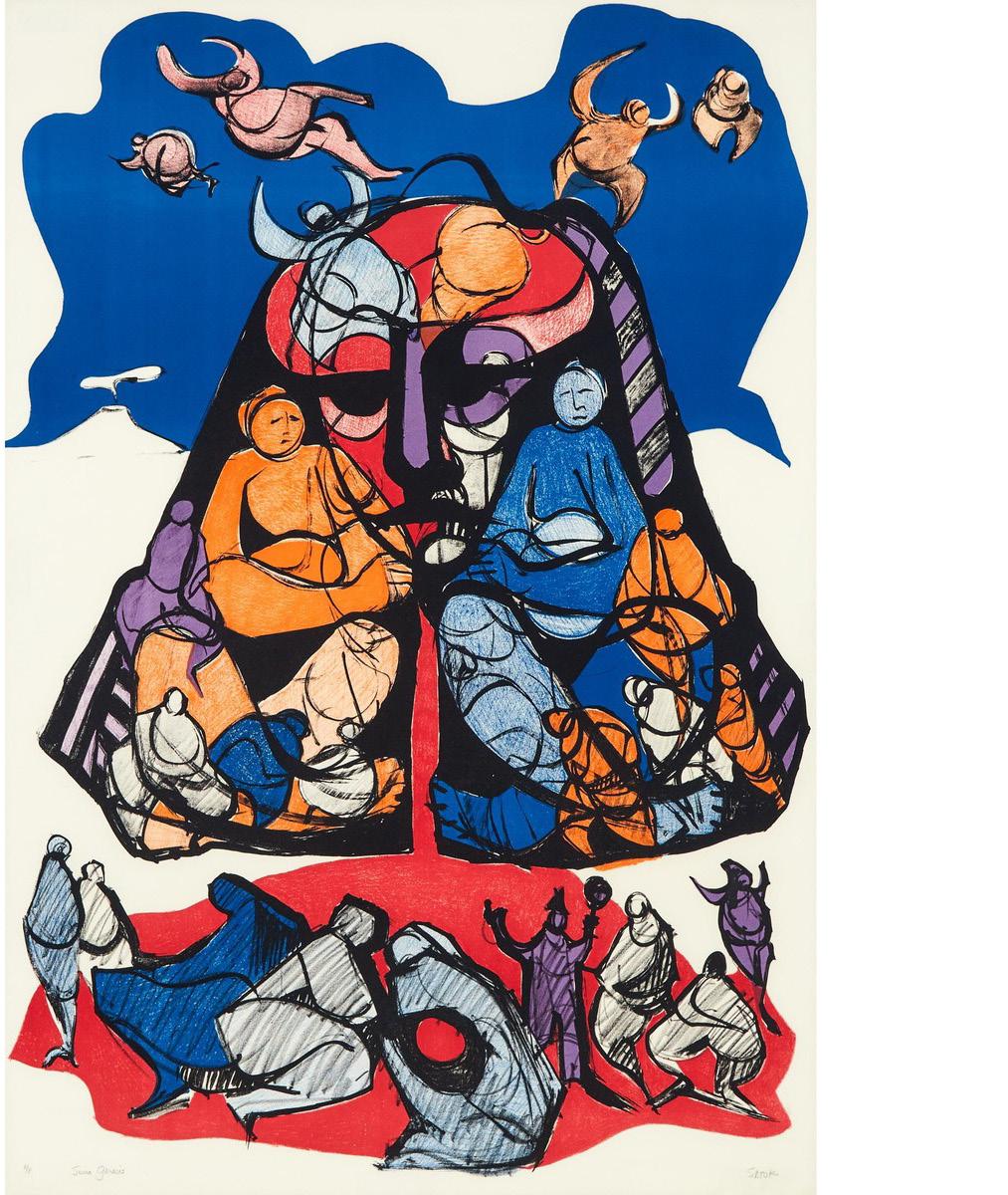 THOMASIE ALIKATUKTUK (B. 1953), PANNIRTUQ (PANGNIRTUNG) MY GREAT GRANDMOTHER WAS A SHAMAN, 1992 stencil; titled, dated and numbered 10/50; artist’s name in Roman and syllabics; framed sight 17.25 x 24.25 in — 43.8 x 61.6 cm