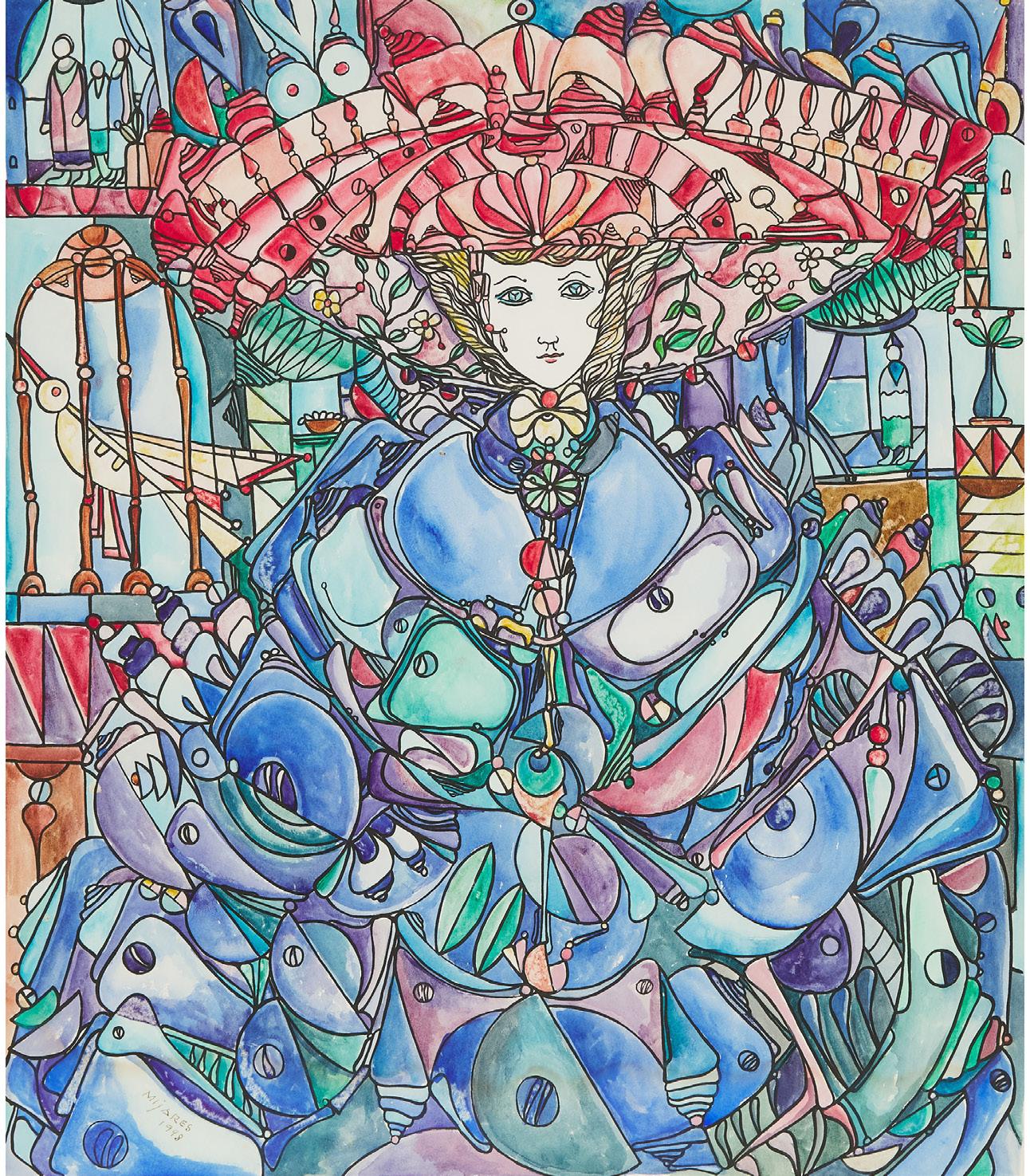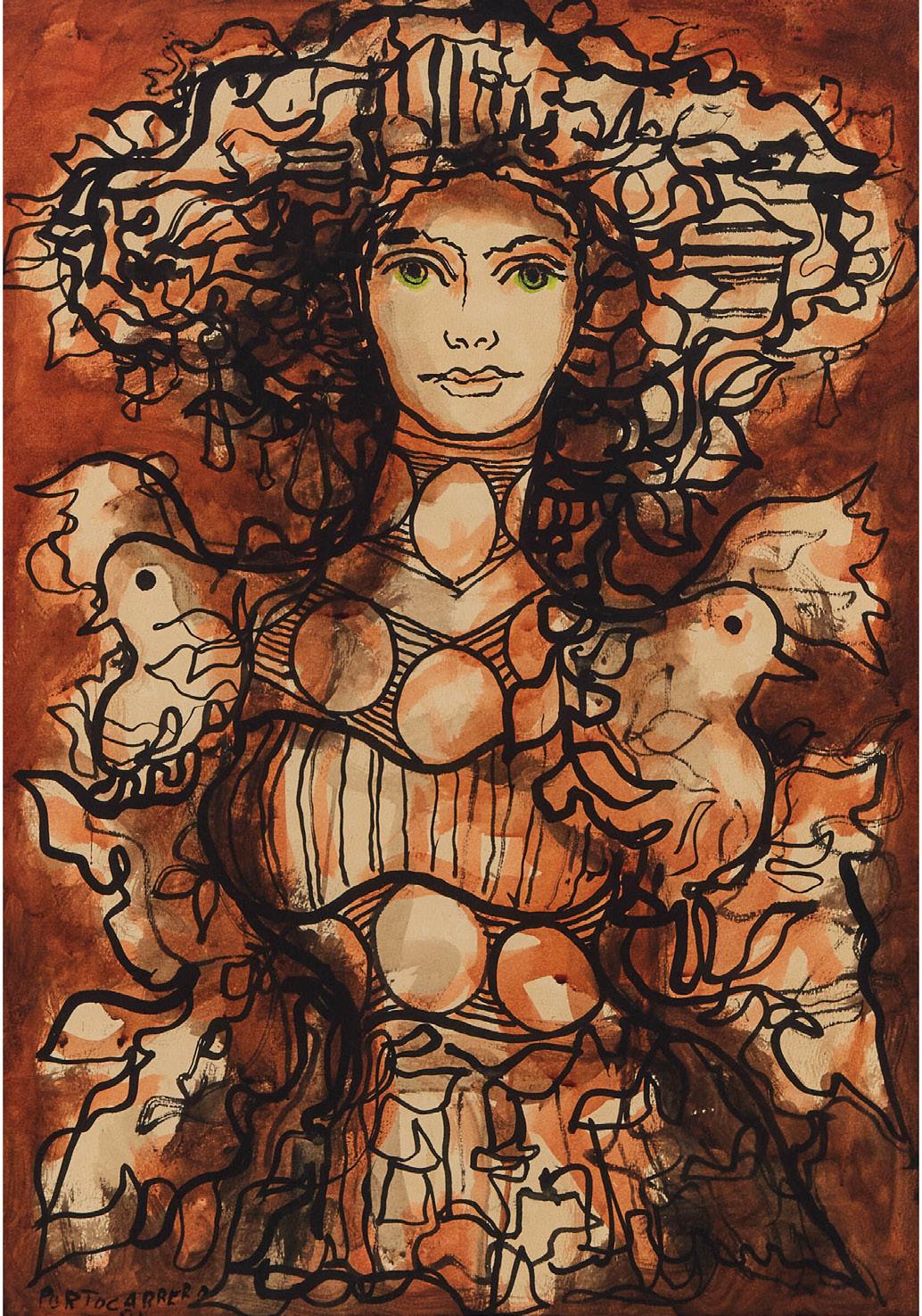 WOMAN WITH BIRDS, 1981 gouache on paper mounted to hardboard; signed and dated “81” lower left; inscribed “Barraga” lower right verso