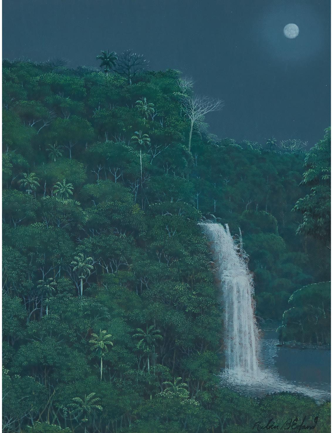 Sánchez’s paintings are carefully rendered and can often take months or years to construct. They often have an otherworldly or Surrealistic feel, drawn from the artist’s inner world. Sánchez has been practicing meditation for decades and sees his paintings as extensions of that practice. His landscapes are not sourced from specific geographies but are instead amalgamations of his imagination and the natural world. Sánchez has explained that “When I enter a state of meditation it’s as if I’m in a jungle or a forest; the mind enters into a great exhilarated state, like an exuberant jungle where you can experience fear, desire, anguish—all types of emotions and feelings. When I begin to feel that there’s a point of inner consciousness everything goes toward that inner space, that inner river. Everything goes toward that place of quiet, that realm of tranquility within the forest where there is a lake.”