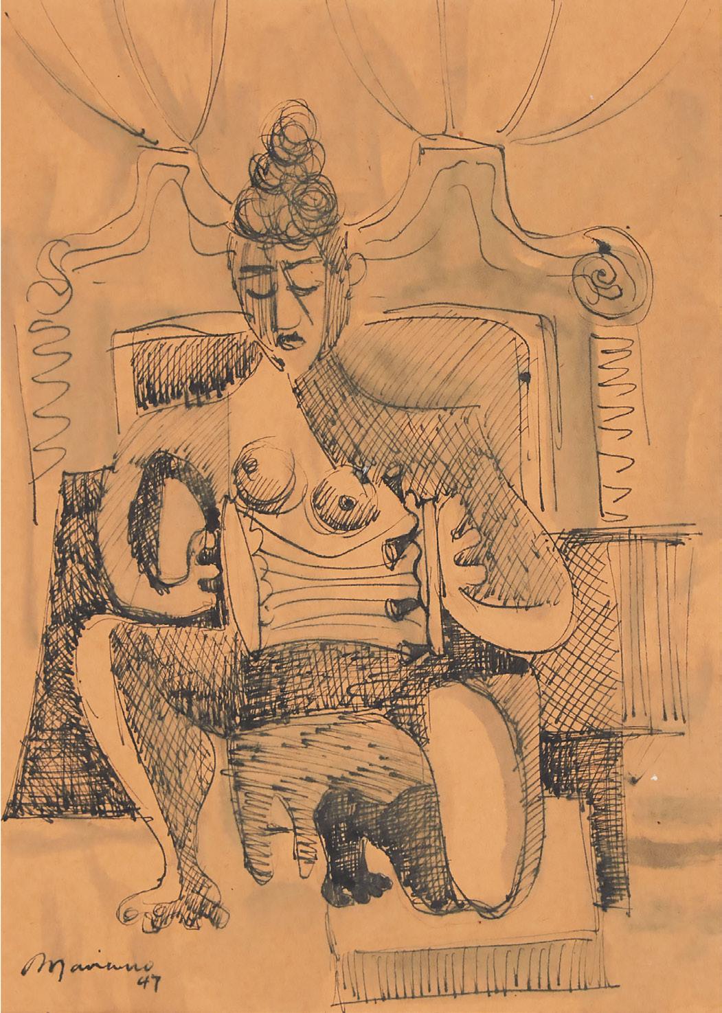 MUJER CON TAMBOR BATÓ, 1947 ink and ink wash on paper; signed and dated “47” lower left sheet 11.1 ins x 8.7 ins; 28.1 cms x 21.2 cms