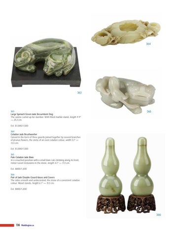 Est. $1,000/1,500 364 Celadon Jade Brushwasher Carved in the form of three gourds joined together by several branches of prunus flowers, the stone of an even celadon colour, width 5.3” — 13.5 cm. Est. $1,000/1,500 365 Pale Celadon Jade Bixie In a crouched position with a small bixie cub climbing along its front, minor russet inclusions in the stone, length 4.5” — 11.5 cm. Est. $800/1,200 366 Pair of Jade Double Gourd Vases and Covers The sides smooth and undecorated, the stone of a consistent celadon colour. Wood stands, height 6.1” — 15.5 cm. Est. $800/1,200