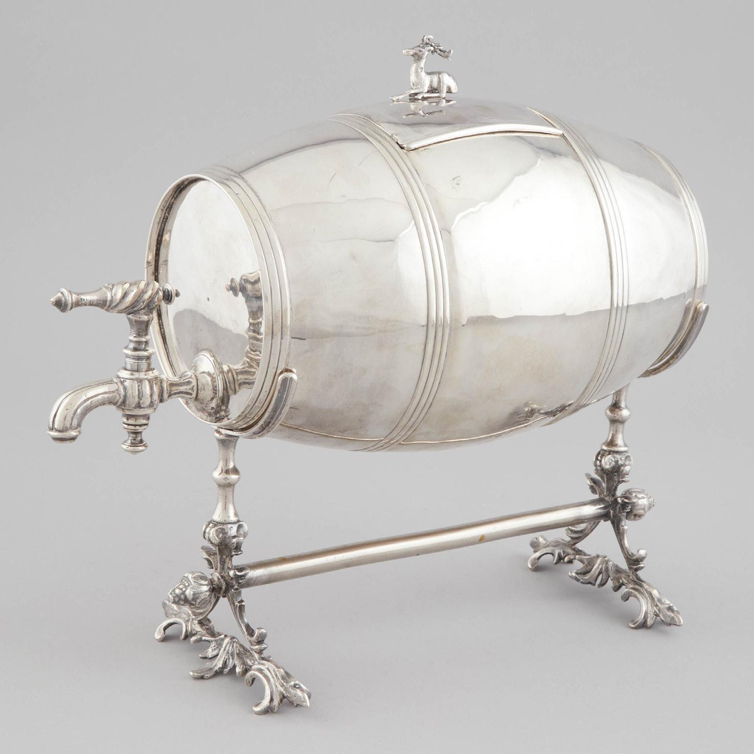 ENGLISH SILVER MOUNTED WHISKEY BARREL, MAPPIN & WEBB, BIRMINGHAM, 1929 with jigger pail, length 9.1 in — 23 cm