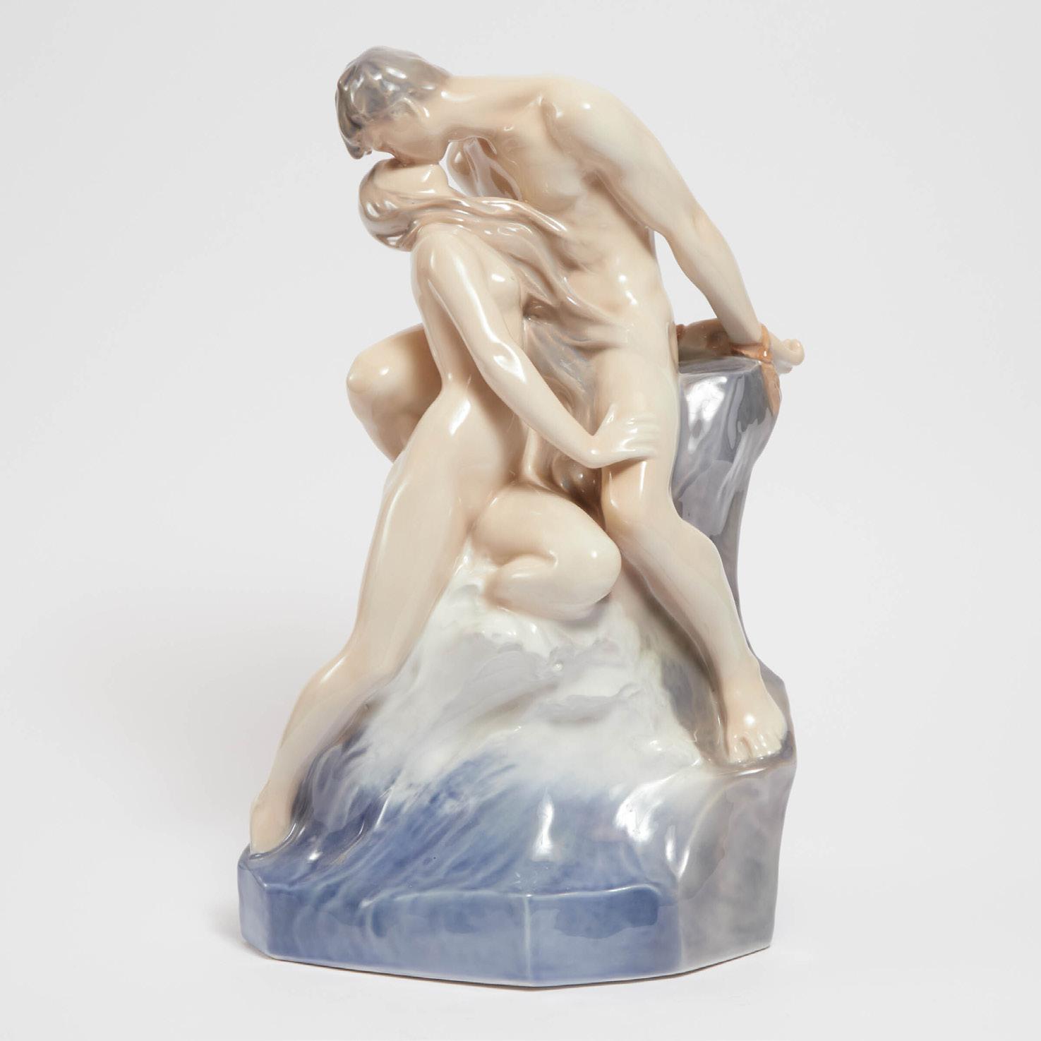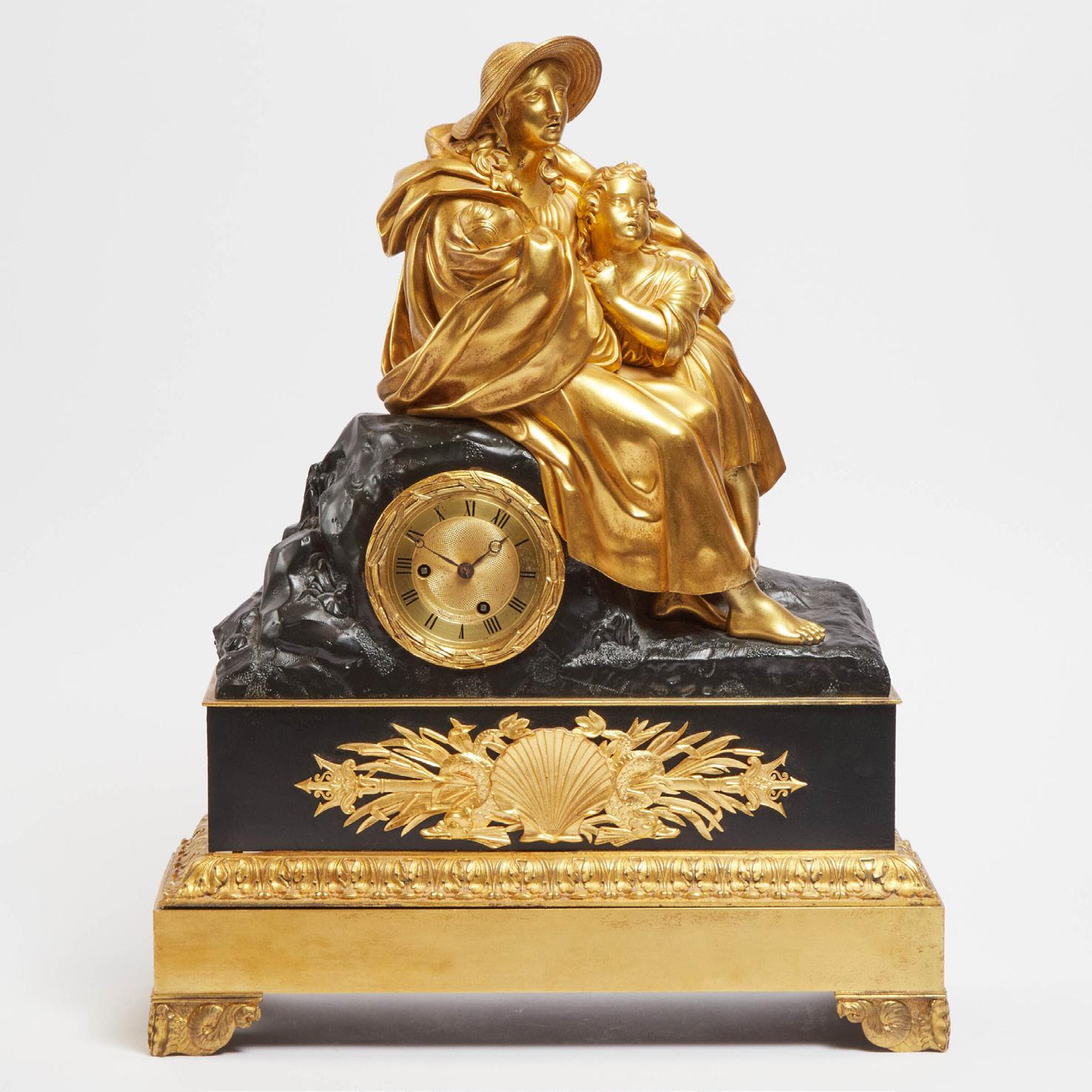 MANTEL CLOCK, MID-19TH CENTURY the 8-day movement signed Japy Frères and striking a bell in a case surmounted by a mother and her children in peril stranded on a rock at sea, 23 x 18 x 6.5 in — 58.4 x 45.7 x 16.5 cm